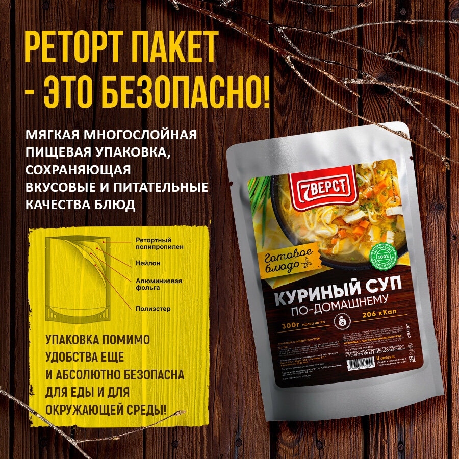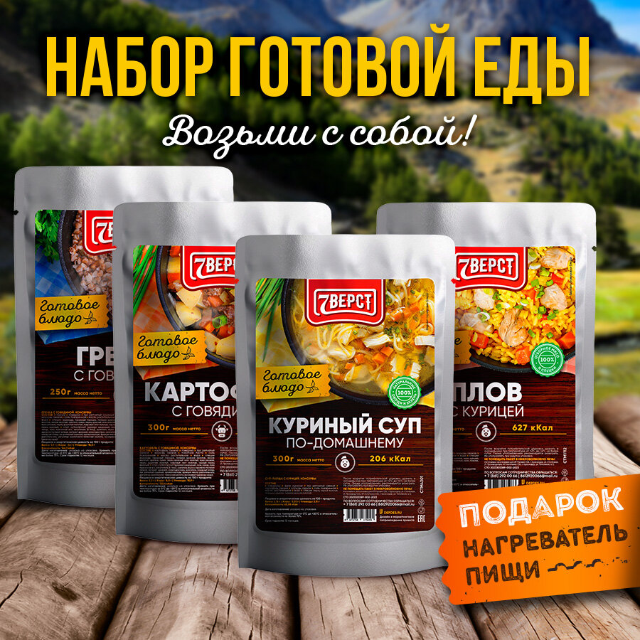 Сохранить7 вёрст Готовые блюда в фольге Набор 4 уп. + Подарок БНП 1 шт. (гречка, картофель с говядиной, куриный суп, плов с курицей) Консервы для походов, охоты, рыбалки интересное: