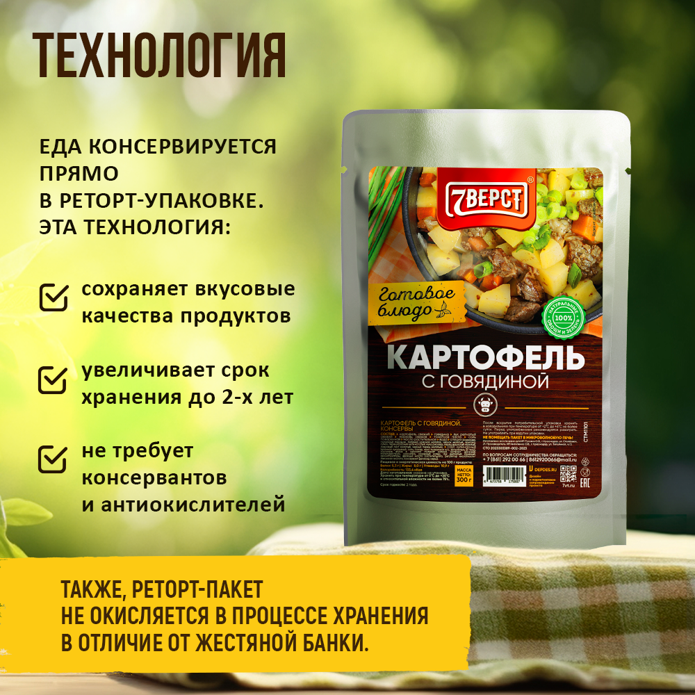 7 вёрст Картофель с говядиной. Готовая еда в реторт-пакете. Консервы натуральные. 1 уп.300 г
