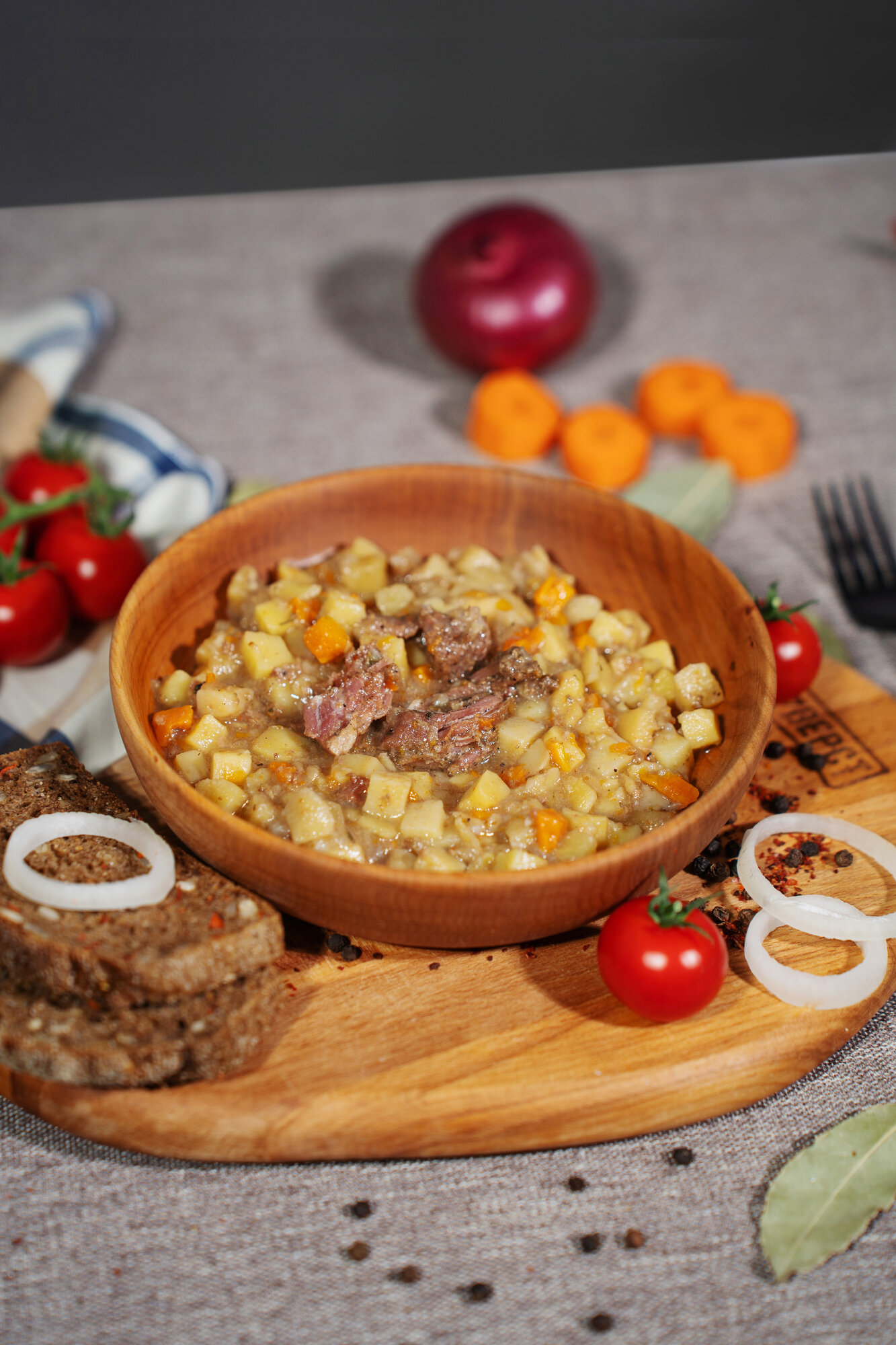 | Состав | Картофель свежий, говядина, лук репчатый свежий, морковь свежая, специи, масло растительное, томатная паста, соус кулинарный, соль |