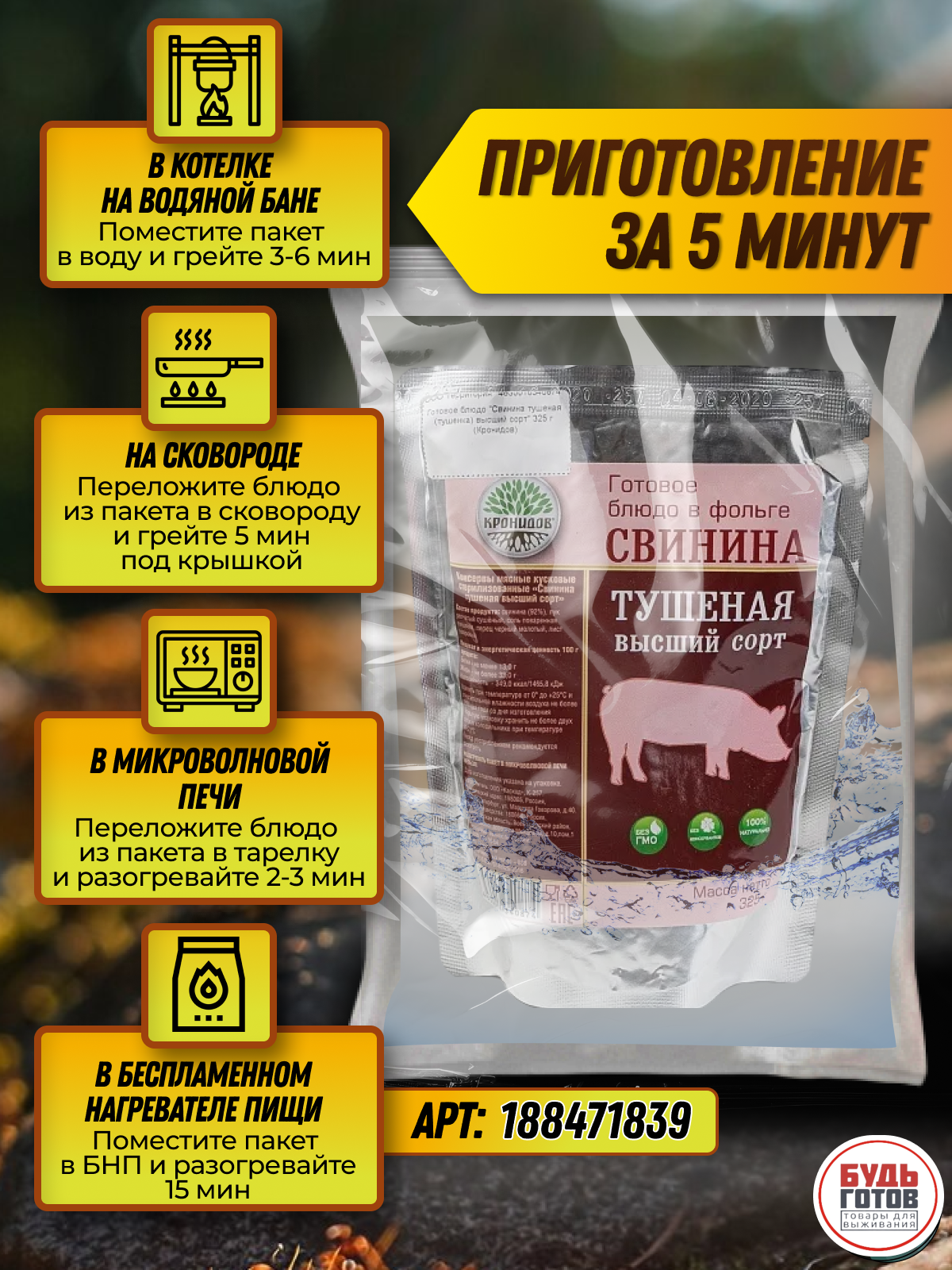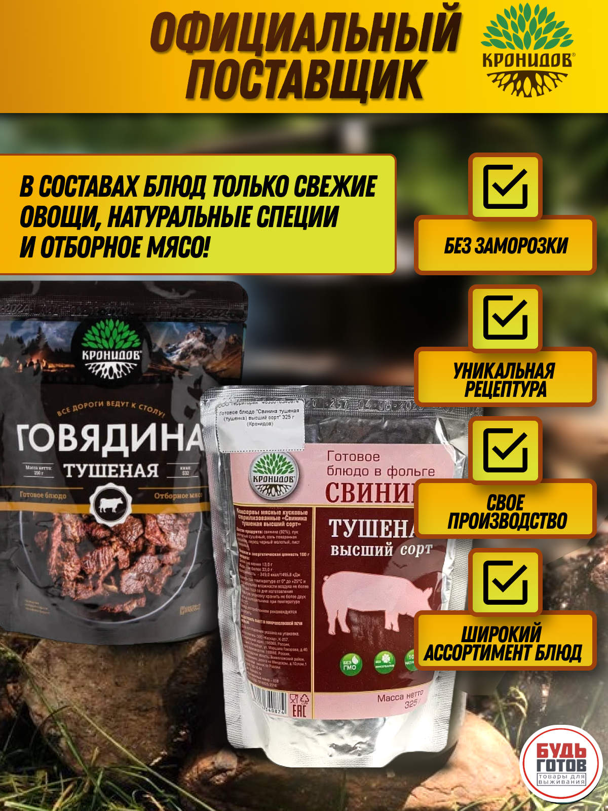 СохранитьГотовое блюдо в реторт-пакете "Свинина тушеная высший сорт" Кронидов. Сухой паек для охоты, рыбалки, в поход. Набор 4 шт. по 250гр. интересное: