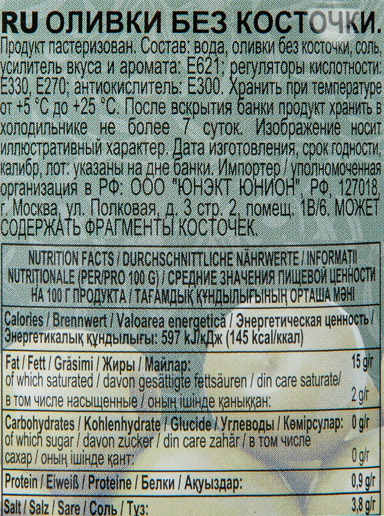 | Состав | вода, оливки без косточки, соль, усилитель вкуса и аромата: глутамат натрия; регуляторы кислотности: лимонная кислота, молочная кислота; антиокислитель: аскорбиновая кислота |