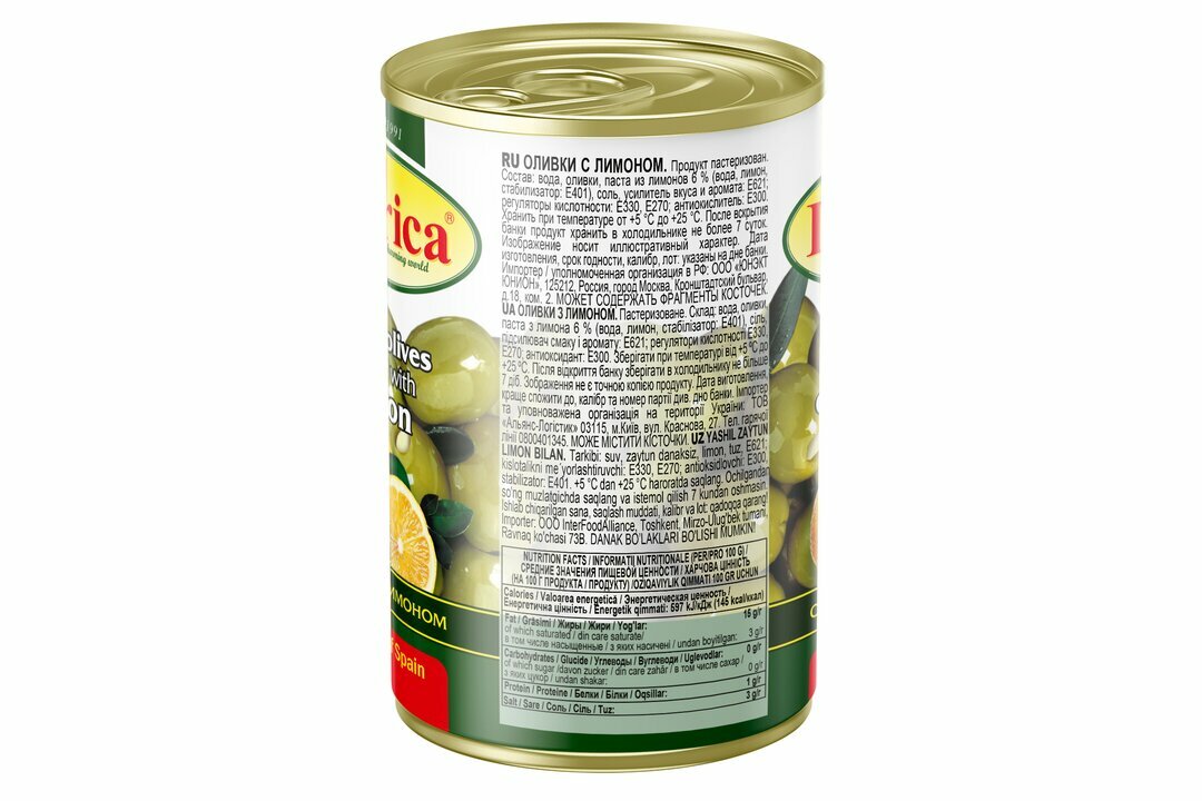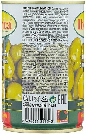 | Состав | вода, оливки, паста из лимонов 6% (вода, лимон, стабилизатор: Е401, Е407), соль, усилитель вкуса и аромата: Е621, регуляторы кислотности: Е330, Е270, антиокислитель: Е300; может содержать косточки |