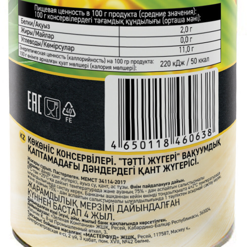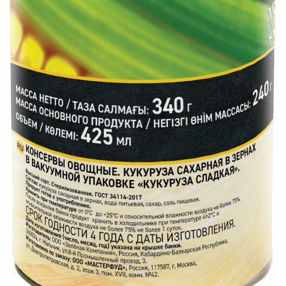 | Состав | кукуруза сахарная в зернах, вода питьевая, сахар, соль пищевая. |