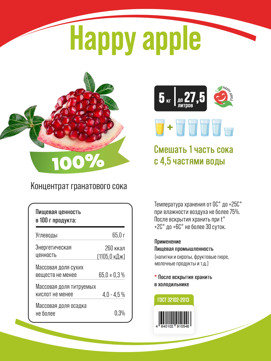 Концентрат сока\Сок концентрированный Гранатовый, кисл. 4,0-4,5% канистра 5 кг, Happy Apple интересное: