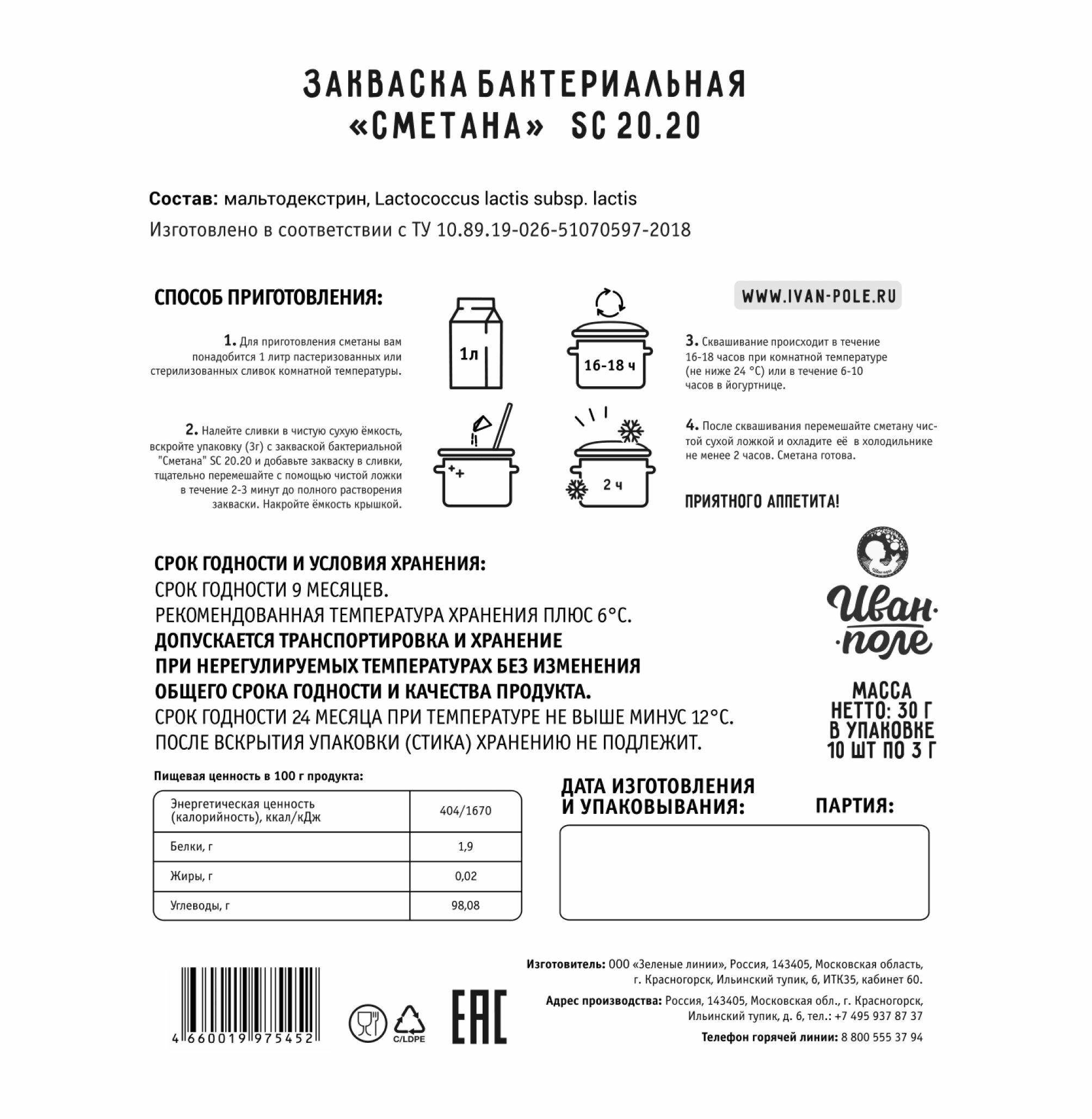 Набор закваска Йогурт с пробиотиком и Сметана, 20 порций, сухая бактериальная, Иван-поле