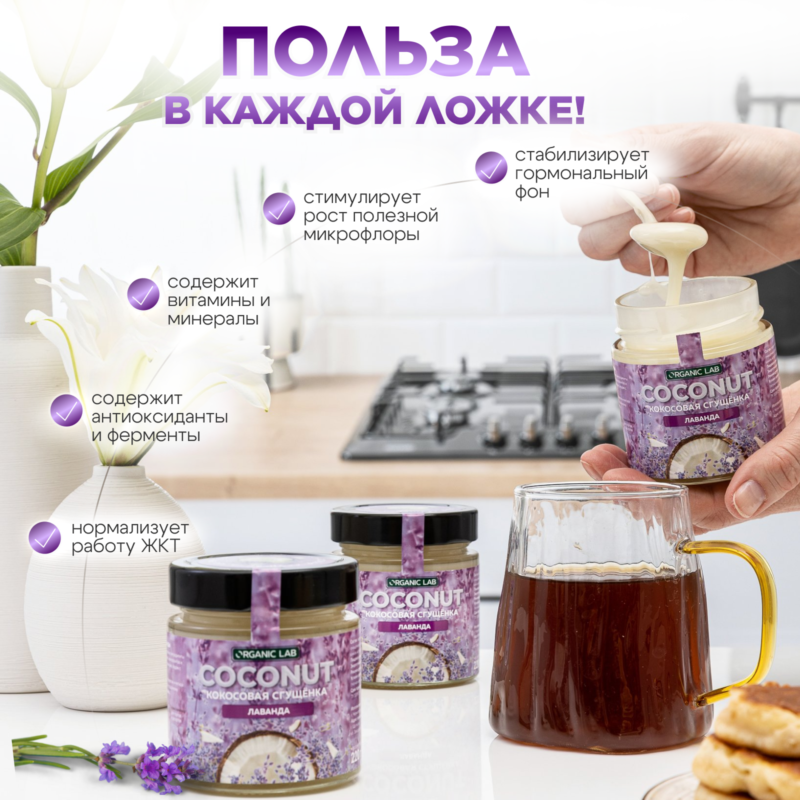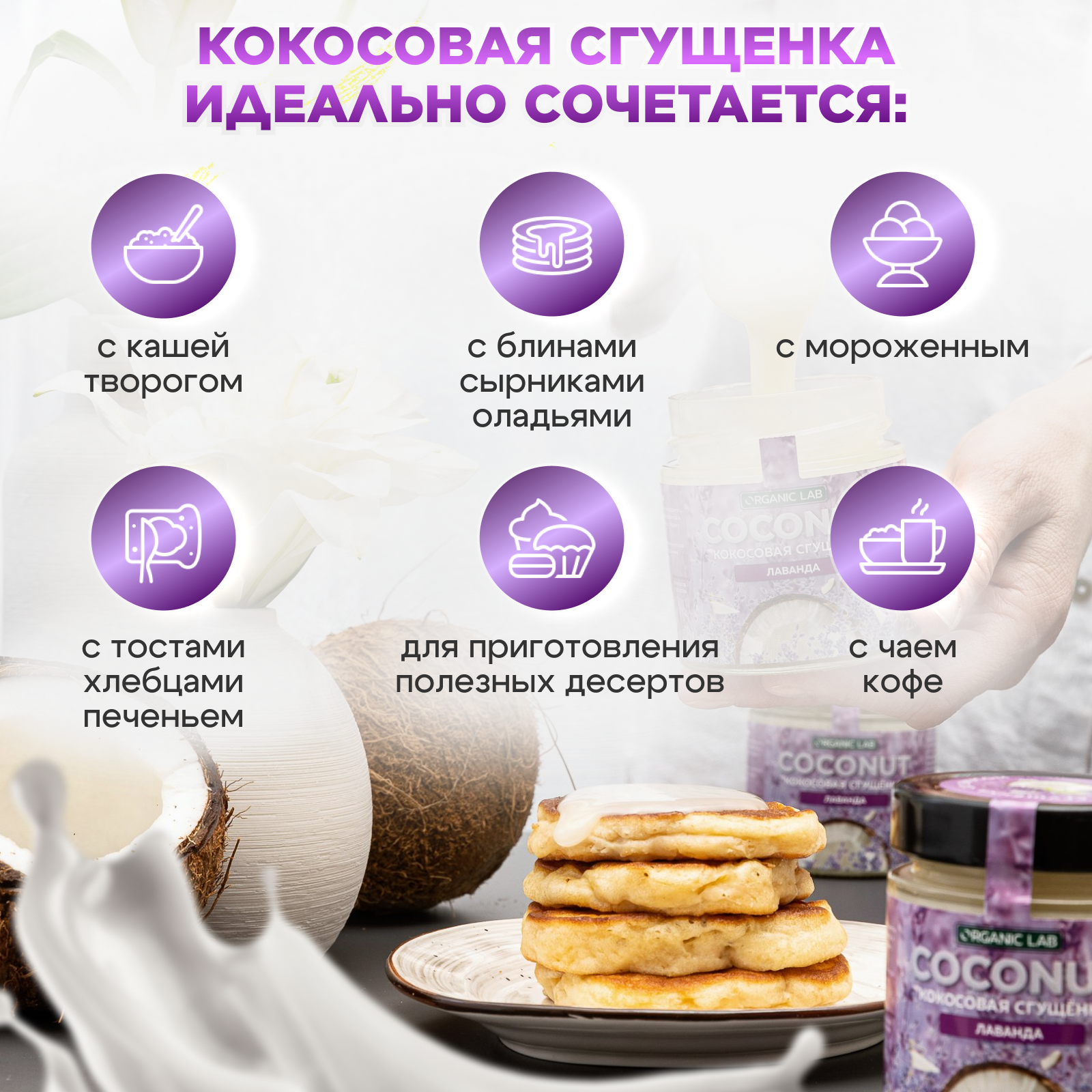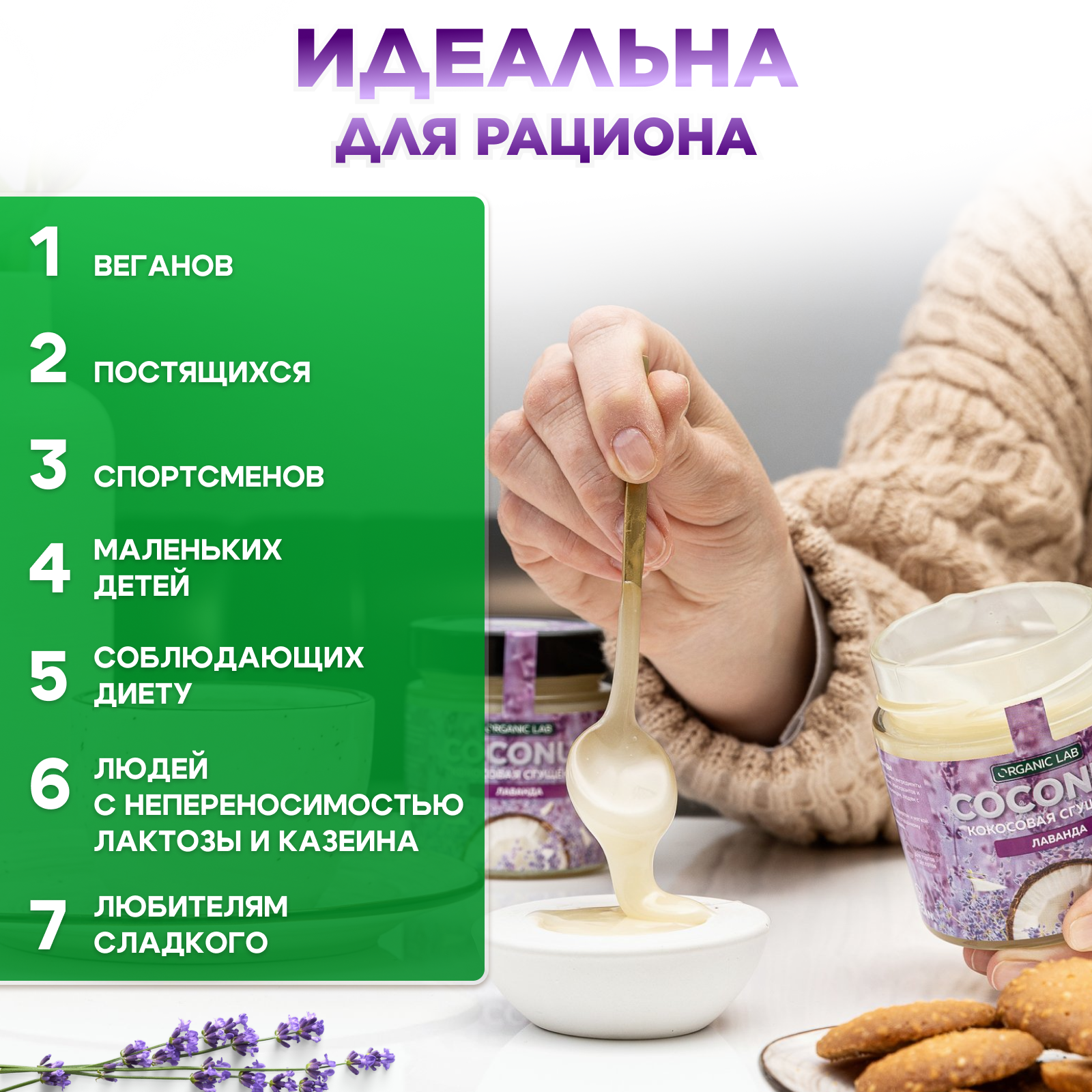 Кокосовая сгущенка ORGANIC LAB со вкусом лаванды, вегетарианский продукт из кокосового урбеча, без глютена и сахара, 220 гр. интересное: