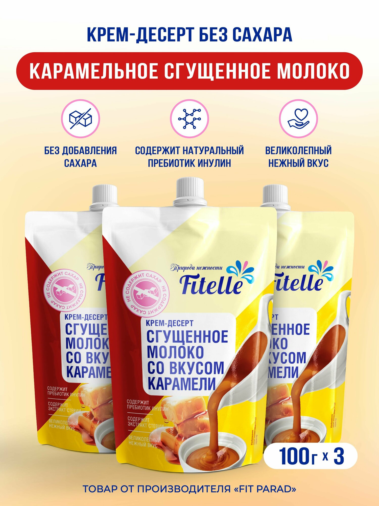 Fitelle / Крем-десерт со вкусом Сгущенное молоко с карамелью, дой-пак набор 3 шт по 100 г. интересное: