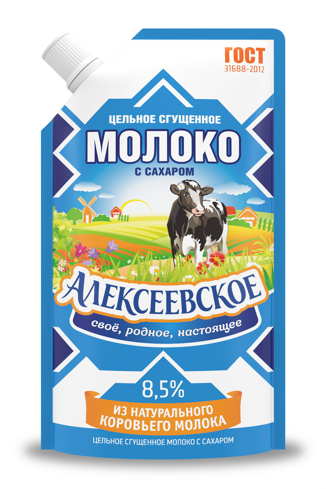 Молоко сгущенное алексеевское, цельное с сахаром, жирность 8,5%, 270 г, дой- пак