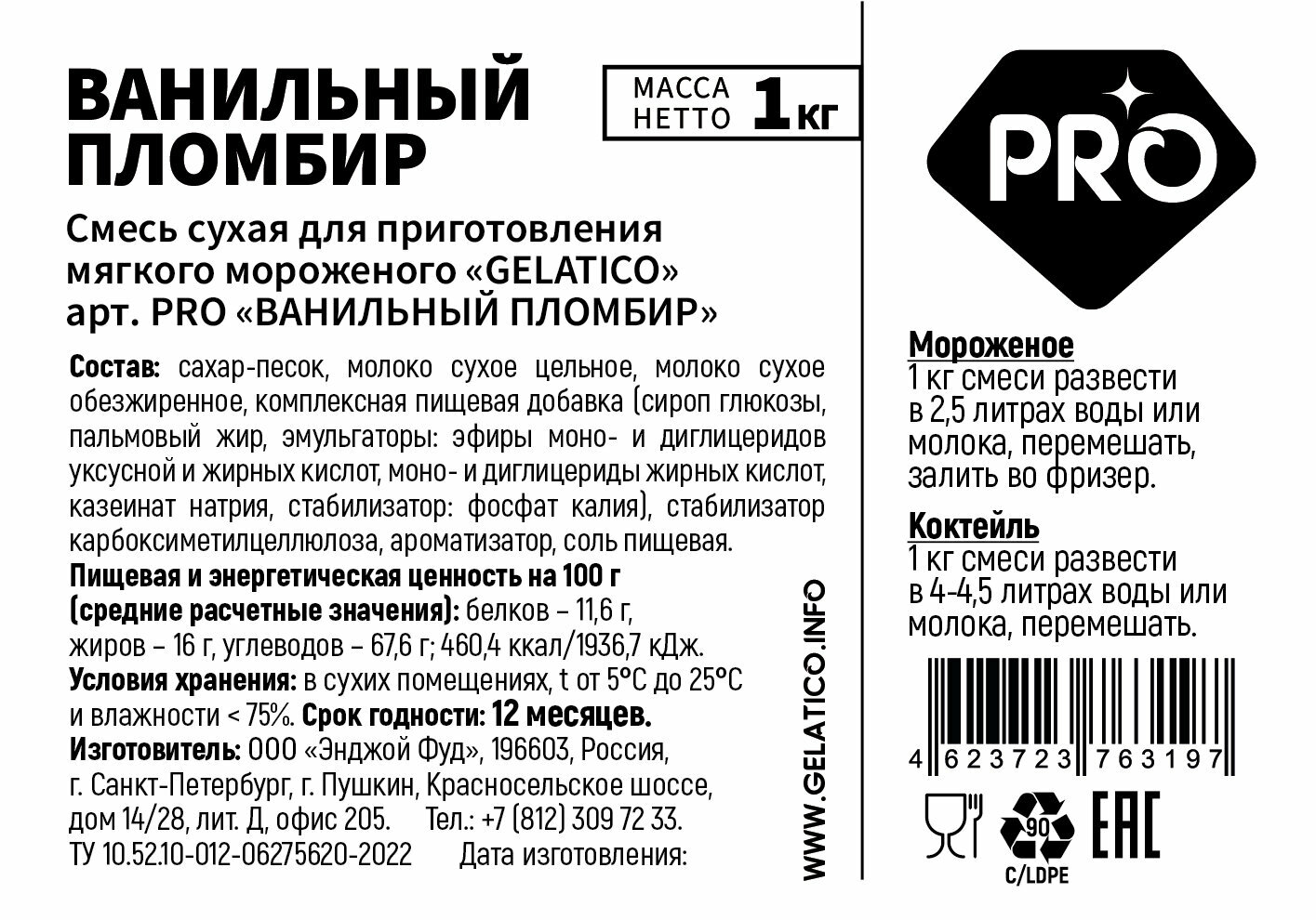 Смесь для мороженого GELATICO PRO/ Сливочный пломбир, 1 кг