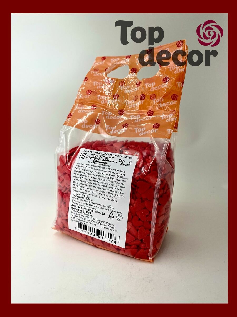 Кондитерская посыпки Top decor, "Сердечки", красные, большие, 750 г 4885608 9273294