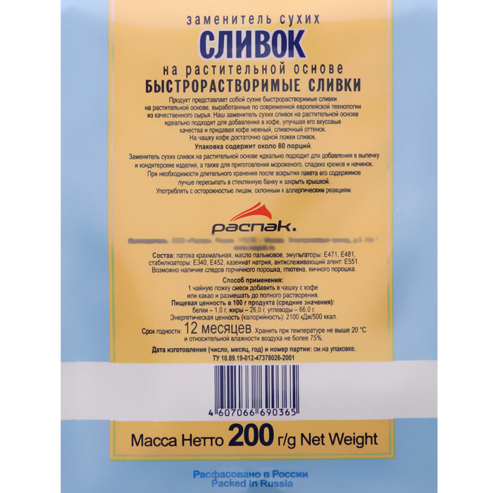 Сливки сухие распак быстрорастворимые, пакет 200 г (80-85 порций), гнз001 интересное: