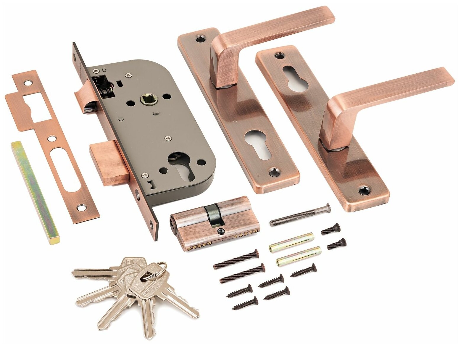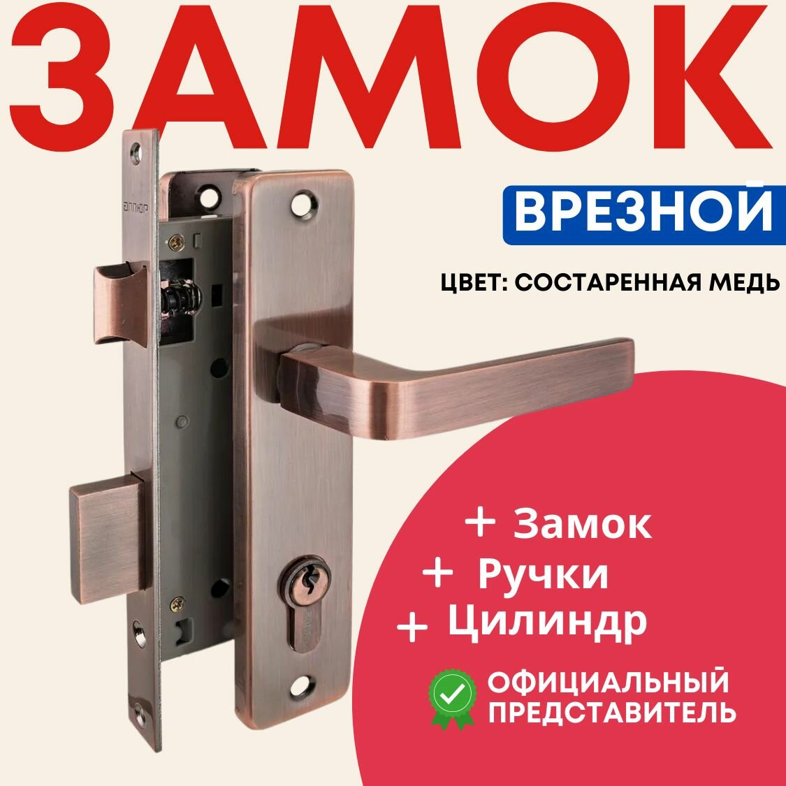Замок врезной Аллюр, 126/1 AC, 1072, ручка в комплекте, цилиндровый, старый медный