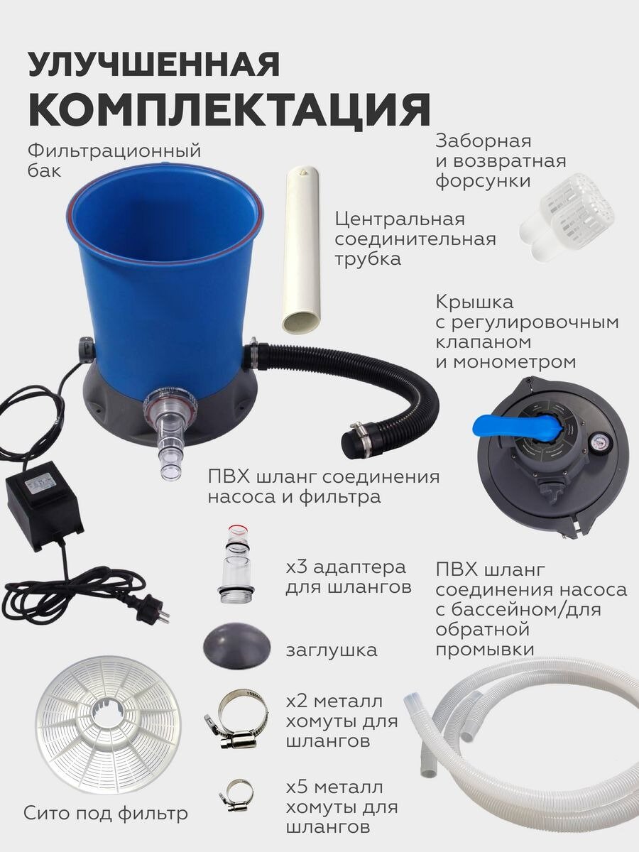 | Комплектация | Фильтрационный бак; Шланг соединения насоса и фильтра; Соеденительная трубка; Форсунки; крышка с клапаном; ПВХ шланг; адаптеры шланг - 3 шт; заглушка; сито; хомуты - 7 шт |