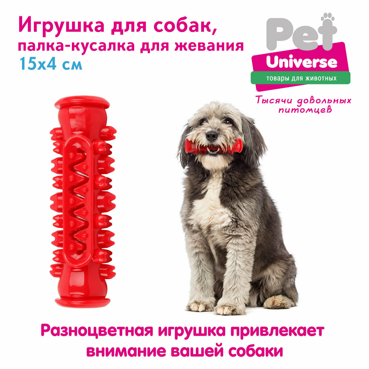 Игрушка для собак Pet Universe зазубренная палка-кусалка с пищалкой для прорезывания и здоровья зубов 15х4 см, ТПР, красный, PU3076R интересное: