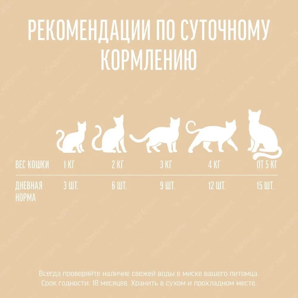 | Дозировка | см. таблицу. Корм готов к употреблению. Проследите, чтобы у вашей кошки всегда была свежая вода. |