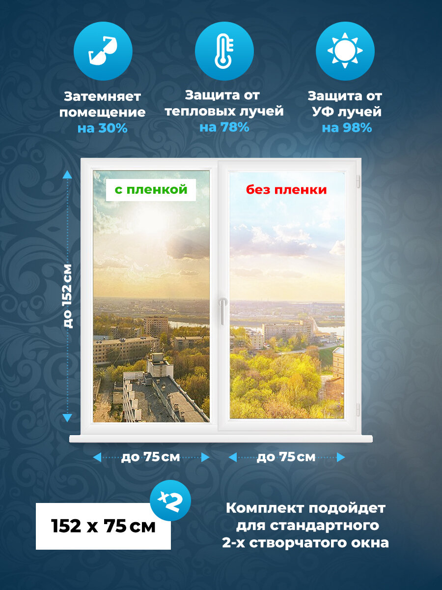 Пленка от солнца на окна Comfort Window. Пленка на окно солнцезащитная. Тонировка черная, комплект на 2-створчатое окно 152х75 х 2 шт