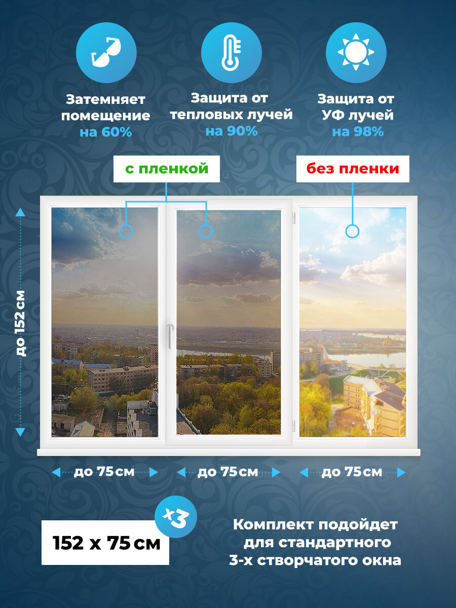 Солнцезащитная пленка для окон. Комплект на 3 створки: 152х75 см. x3 шт