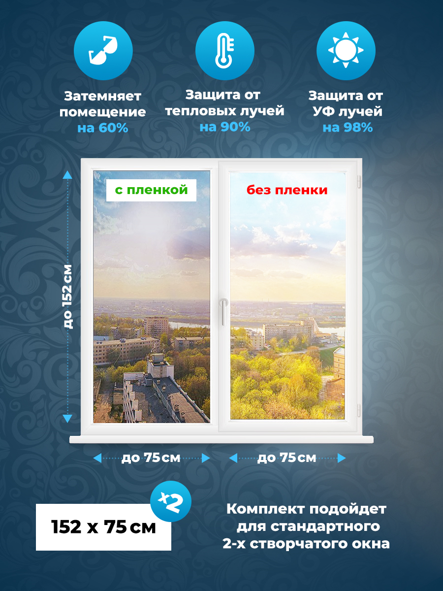 Пленка от солнца на окна Comfort Window. Пленка на окно солнцезащитная. Тонировка черная, комплект на 2-створчатое окно 152х75 х 2 шт
