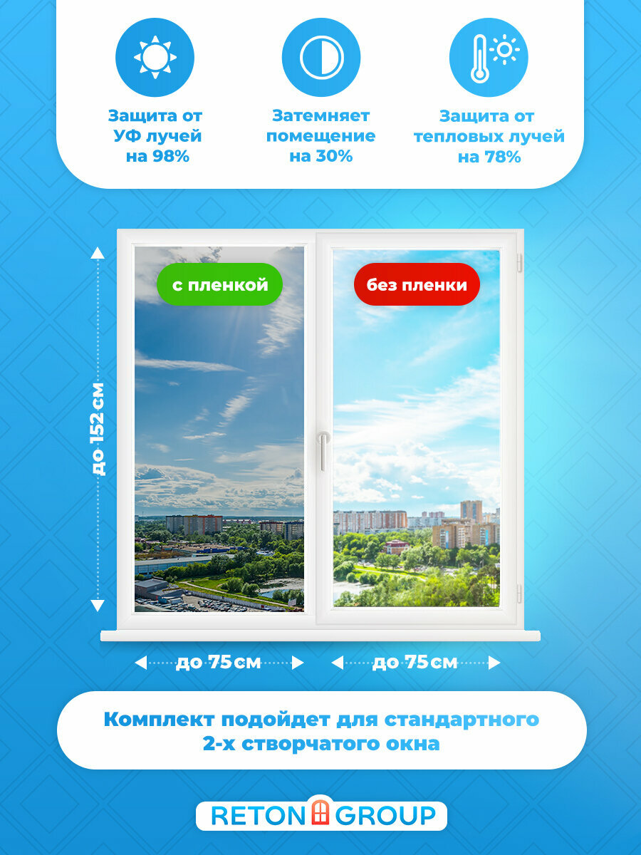 Атермальная пленка Nano 90 Reton Group. Самоклеющаяся пленка для окон 152х75 см х 3 шт. (комплект на 3 створки)