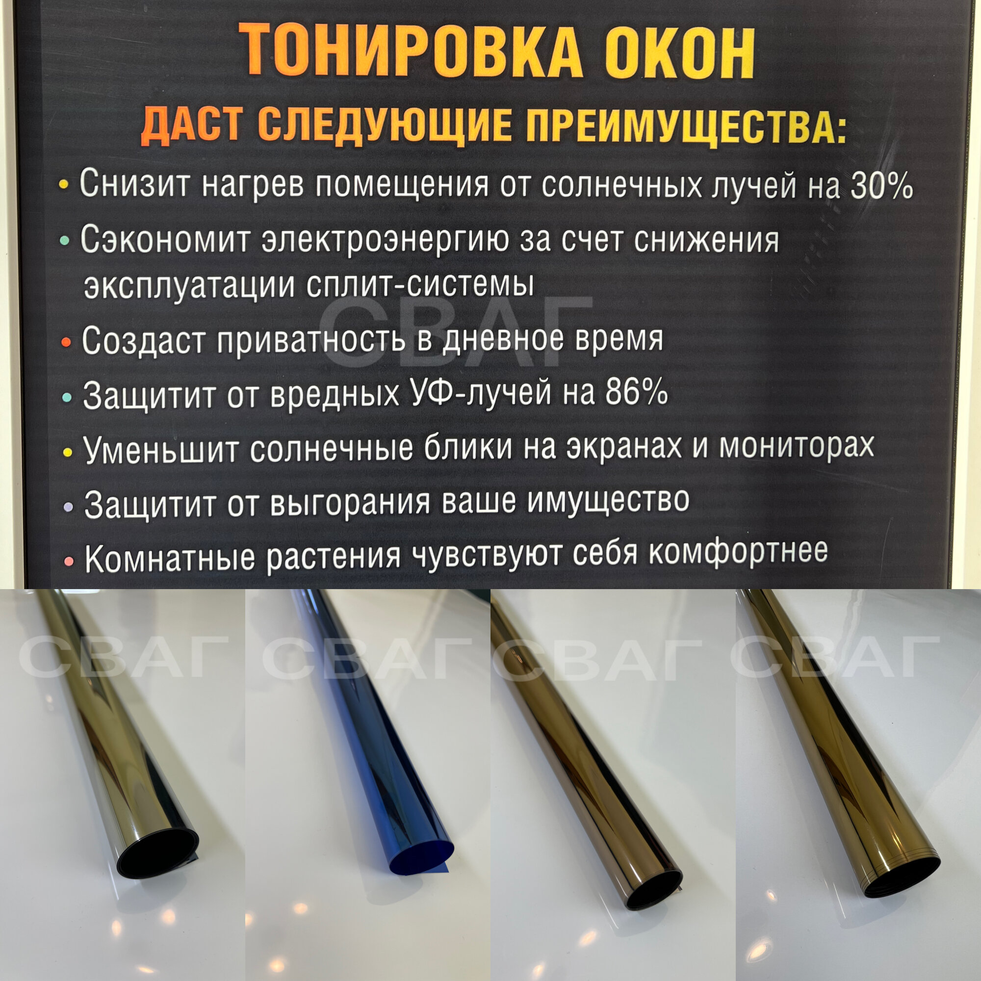 | Дополнительная информация | отражение энергии солнца 63%; отражение УФ излучения в 98%; пропускание видимого света в 16%; толщина 42 мкм; защита от царапин |