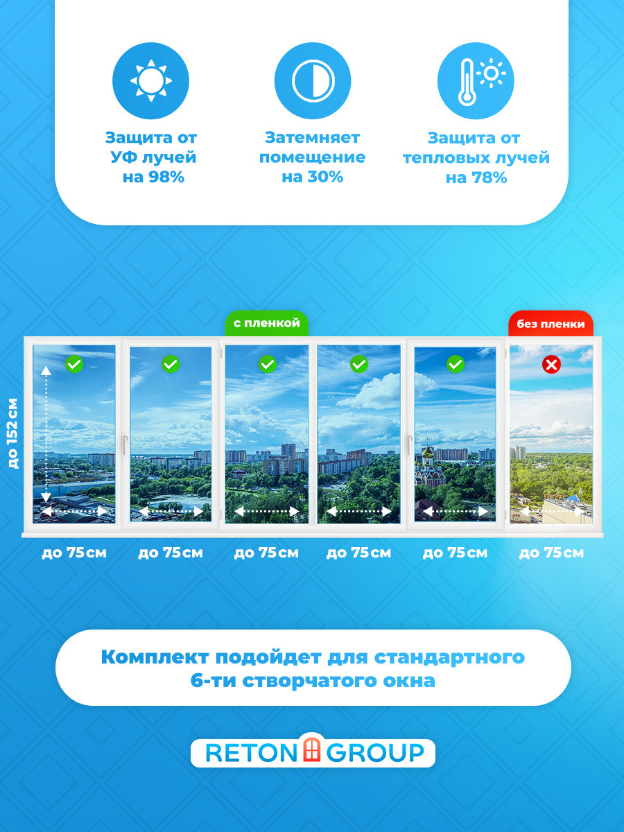 Ниже Вы можете прочитать отзывы на Зеркальная Солнцезащитная пленка для окон. Самоклеющаяся пленка для окон Blue 15 ( комплект на шесть створок) 75х152см - 6 шт., ознакомится с подробными характеристиками, посмотреть интересные обзоры и фотографии на Зеркальная Солнцезащитная пленка для окон. Самоклеющаяся пленка для окон Blue 15 ( комплект на шесть створок) 75х152см - 6 шт..