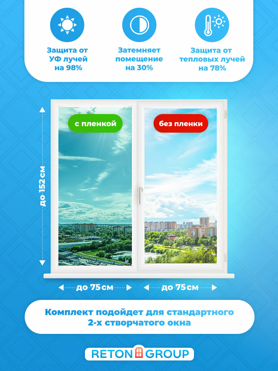СохранитьСолнцезащитная пленка для окон Green 15 Reton Group. Пленка зеркальная самоклеющаяся - комплект на две створки: (зеленая) : 152х75 см x 2 шт интересное: