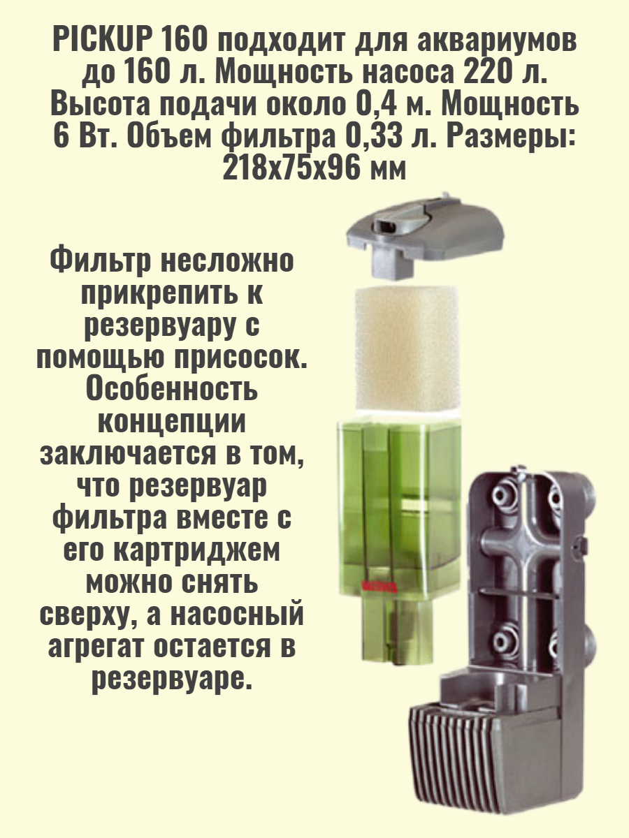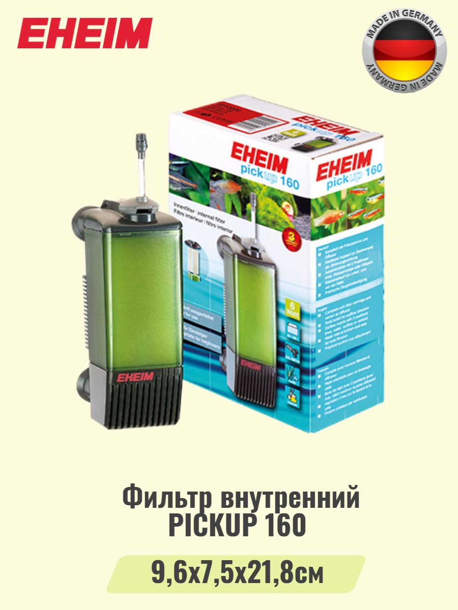 | Дополнительная информация | Особенность концепции Eheim pickup заключается в том, что фильтр канистру вместе с его картриджом можно снять сверху, а насос остается в аквариуме. Это очень практичное решение для очистки или замены фильтров. |