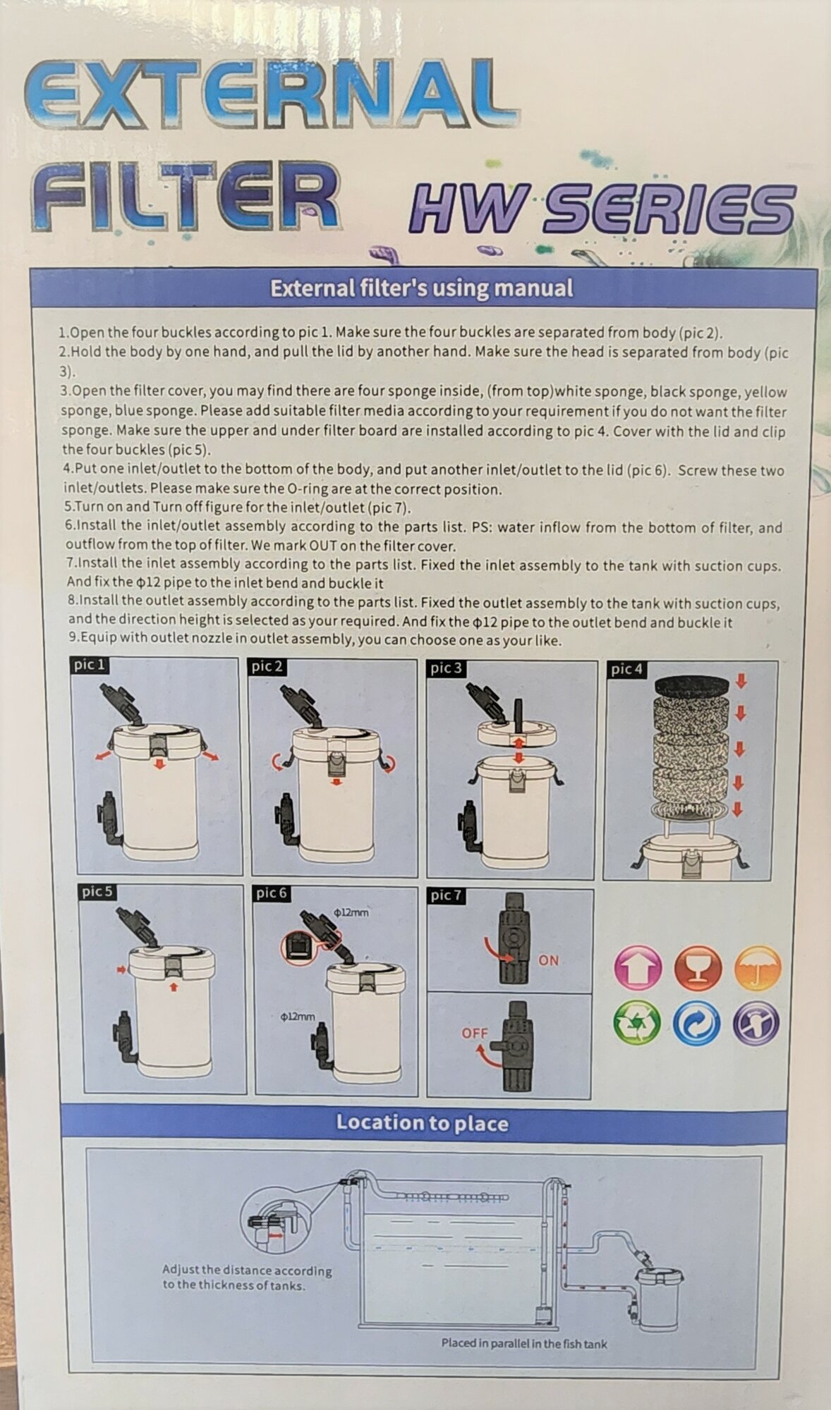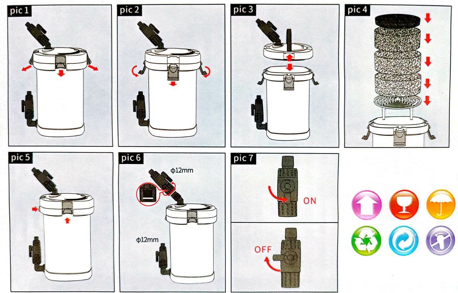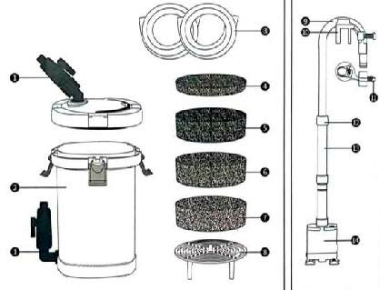 | Дополнительная информация | Фильтр можно устанавливать как рядом с аквариумом так и в тумбе под аквариумом. Внимание поток воды, напрямую зависит от высоты подъема, чем ниже фильтр тем меньше поток. Помпа встроена в поддон фильтра и находится внутри корпуса, что дополнительно защищает фильтр от протекания и уменьшает уровень шума. Фильтр абсолютно герметичный и плотно закрывается на четыре защелки. Корпус фильтра изготовлен из прочного пластика, не подвержен окислению, нейтрален к воде. Дополнительно на крышке фильтра установлена ручка, для удобного обслуживания и чистки фильтра. |