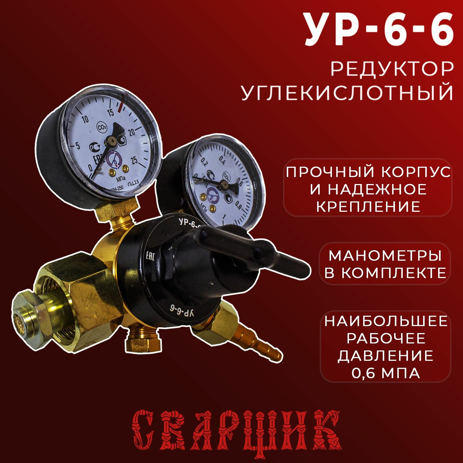 Ниже Вы можете прочитать отзывы на Редуктор углекислотный Сварщик УР-6-6, ознакомится с подробными характеристиками, посмотреть интересные обзоры и фотографии на Редуктор углекислотный Сварщик УР-6-6.