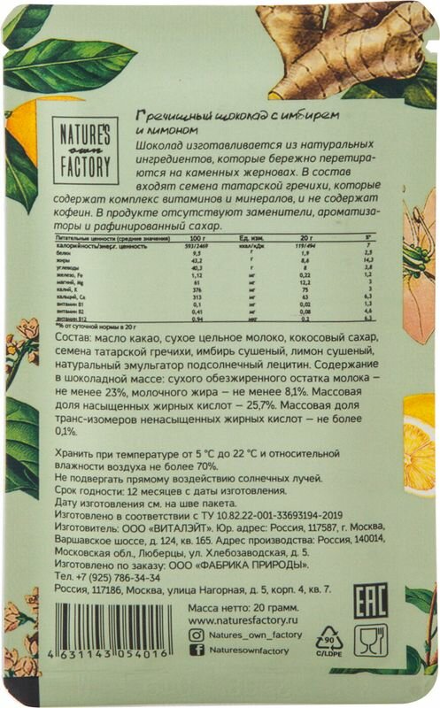 Шоколад гречишный NATURES OWN FACTORY с имбирем и лимоном, 20г