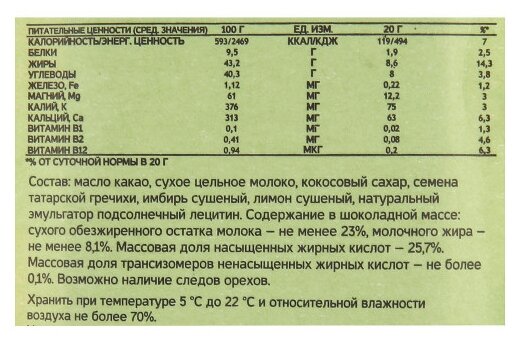 | Состав | масло какао, сухое цельное молоко, кокосовый сахар, семена татарской гречихи, имбирь сушеный, лимон сушеный, натуральный эмульгатор подсолнечный лецитин; возможно наличие следов орехов |