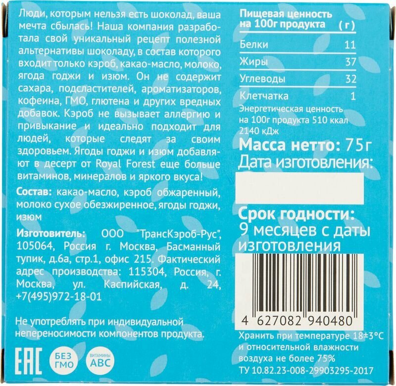 | Состав | кэроб, какао-масло, сухое молоко, ягода годжи, изюм |