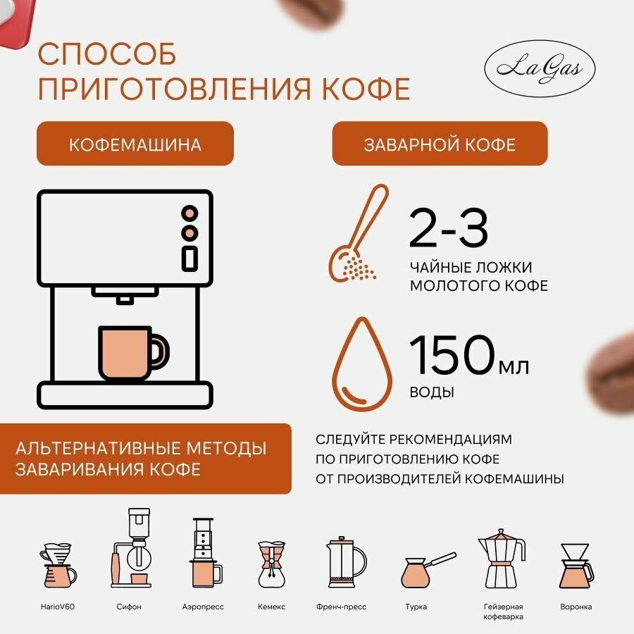 | Способ заваривания | аэропресс, гейзерная кофеварка (мока), джезва, кемекс, френч-пресс, чашка, эспрессо |