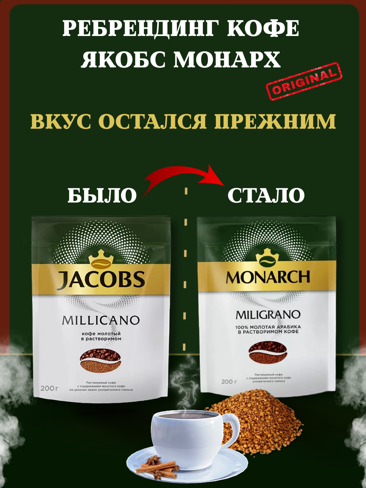 Кофе молотый в растворимом Monarch Miligrano, 2 упаковки по 200 г интересное: