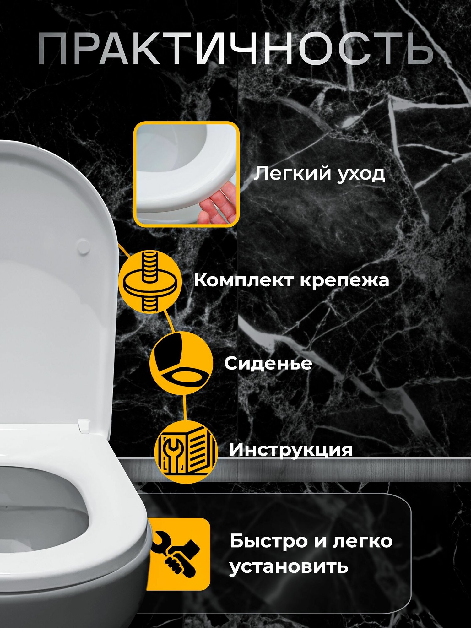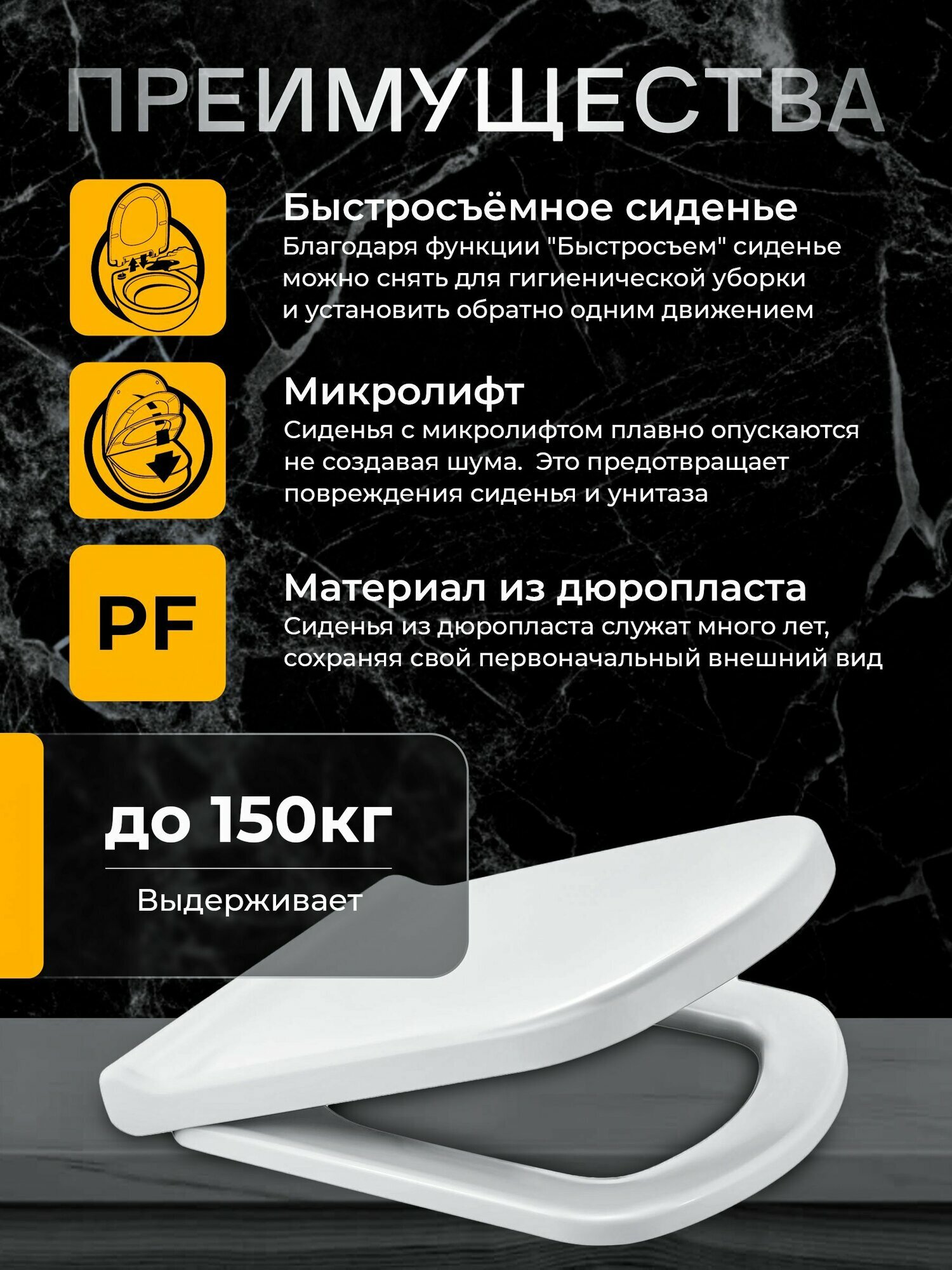 | Дополнительная информация | Оснащено микролифтом для плавного и бесшумного опускания крышки. Совместимость с Laufen: Pro, Form; Vitra: S50 |