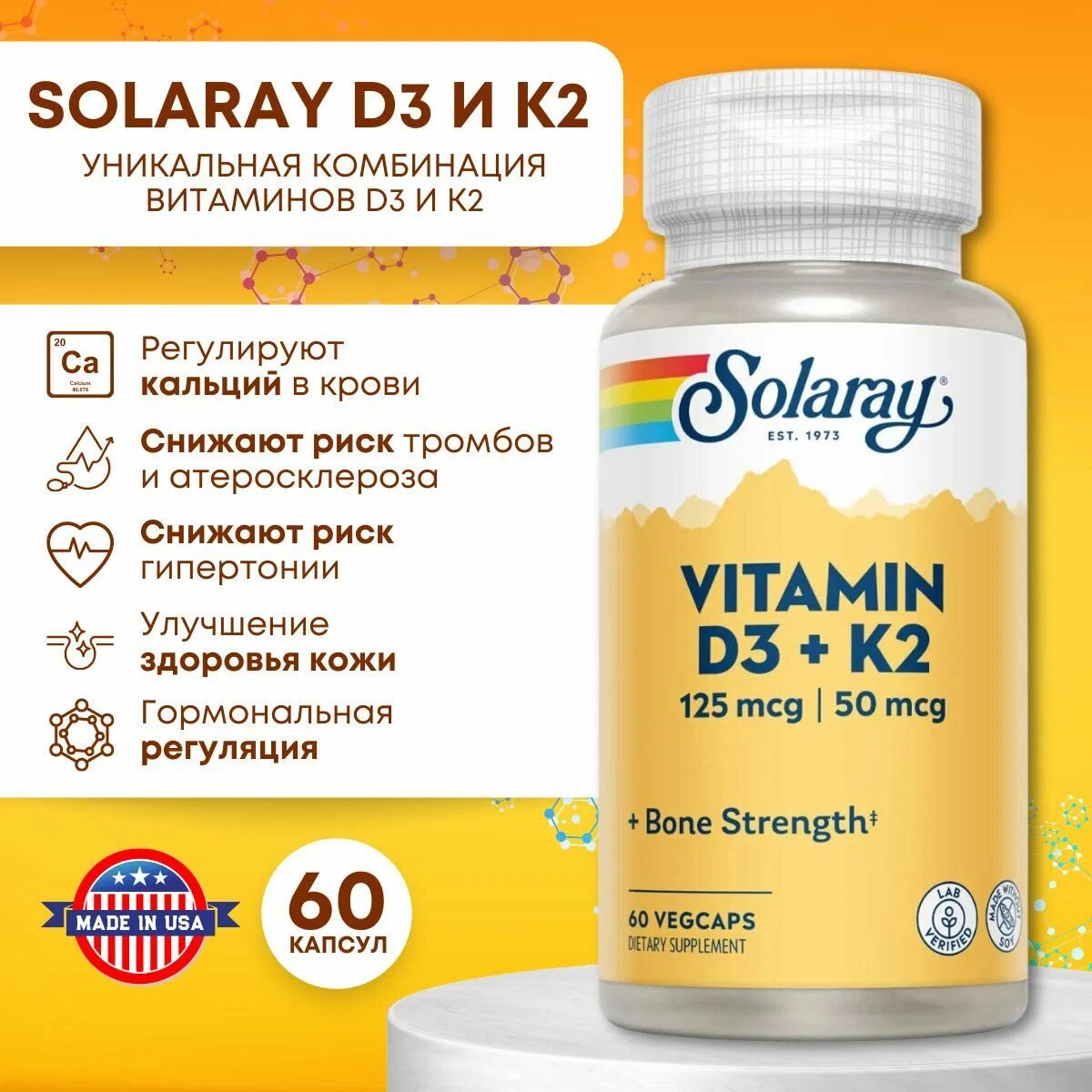 Витамины D3 и K2, без сои, 125 мкг (5000 МЕ), Solaray, 60 растительных капсул интересное: