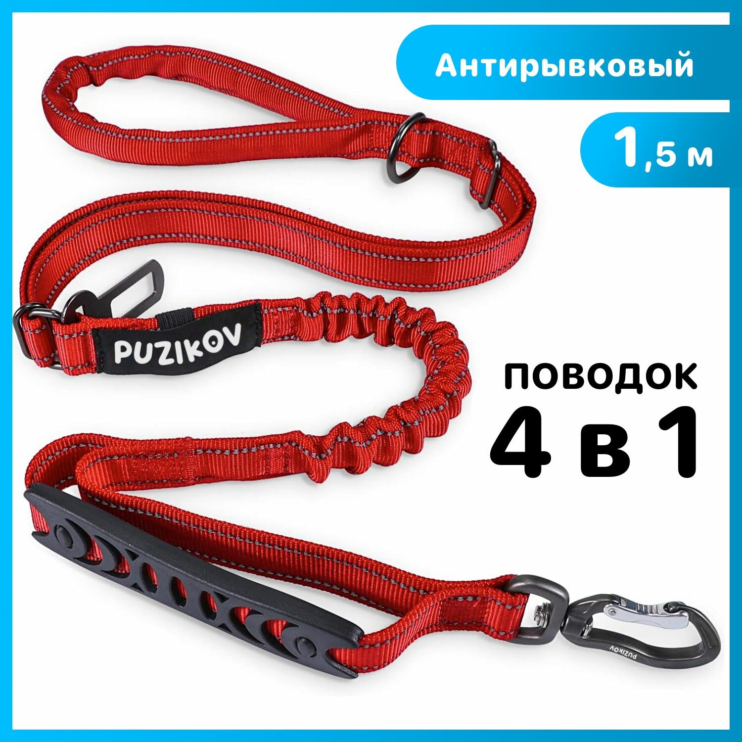 Поводок для собак Антирывковый с усиленным карабином 4 в 1 для средних и крупных пород, 3-5 метров, красный, PUZIKOV / пузиков