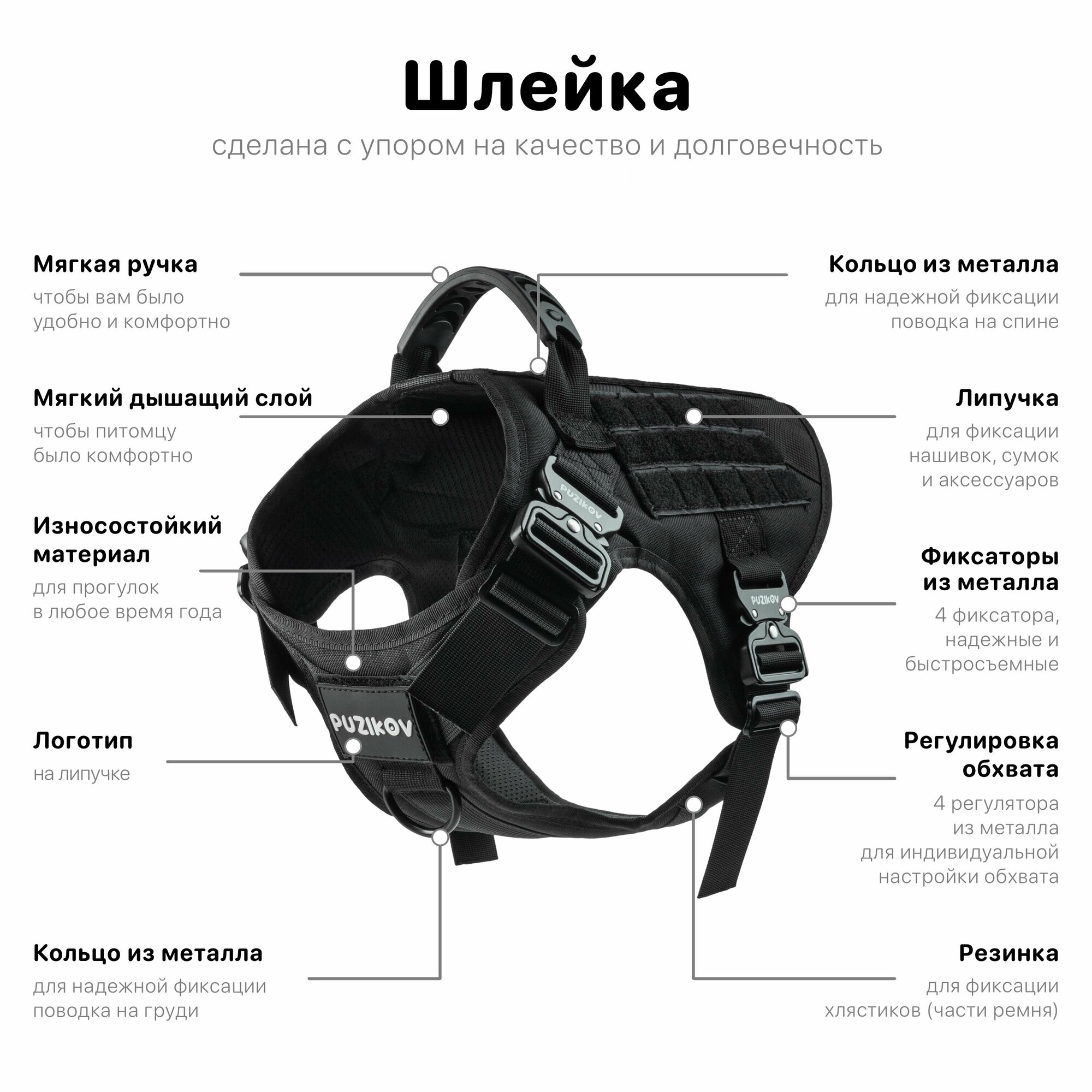 Шлейка для собак тактическая усиленная с фиксаторами из металла для средних и крупных пород, размер XL, черный PUZIKOV / пузиков