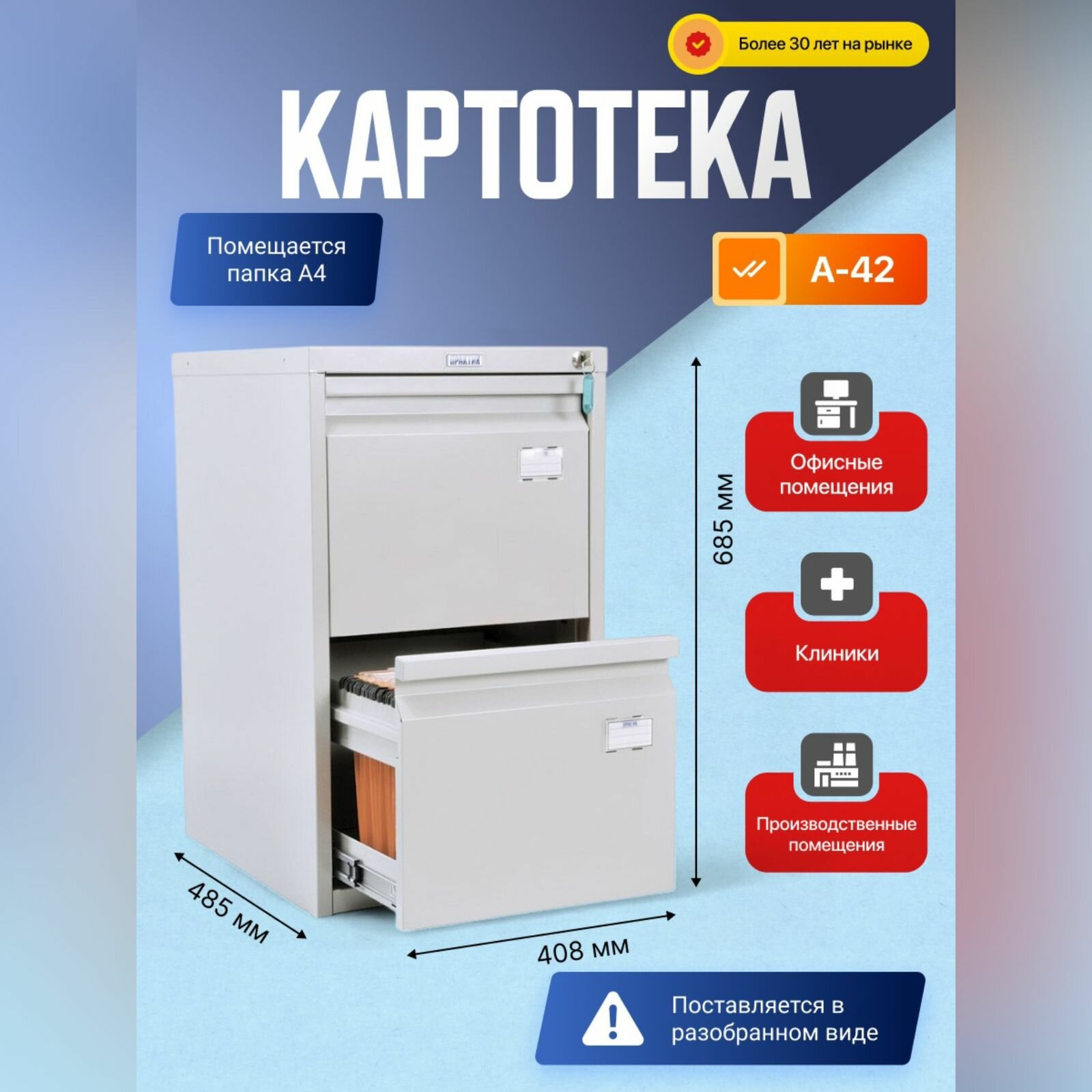 Картотека для хранения документов формата А4 ПРАКТИК А-42, металлическая, напольная, серая, 69х41х49см
