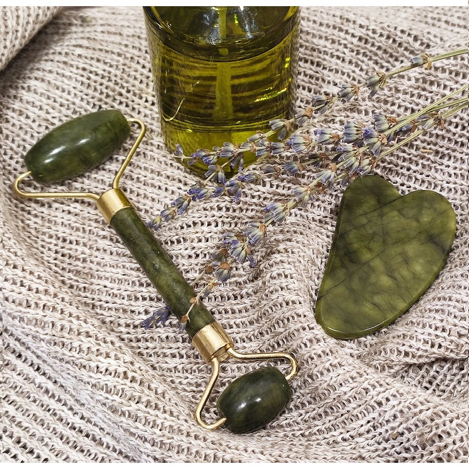 Elza Aziatica / Набор массажный роллер и скребок гуаша из нефрита, зеленый/ массажер для лица натуральный камень интересное: