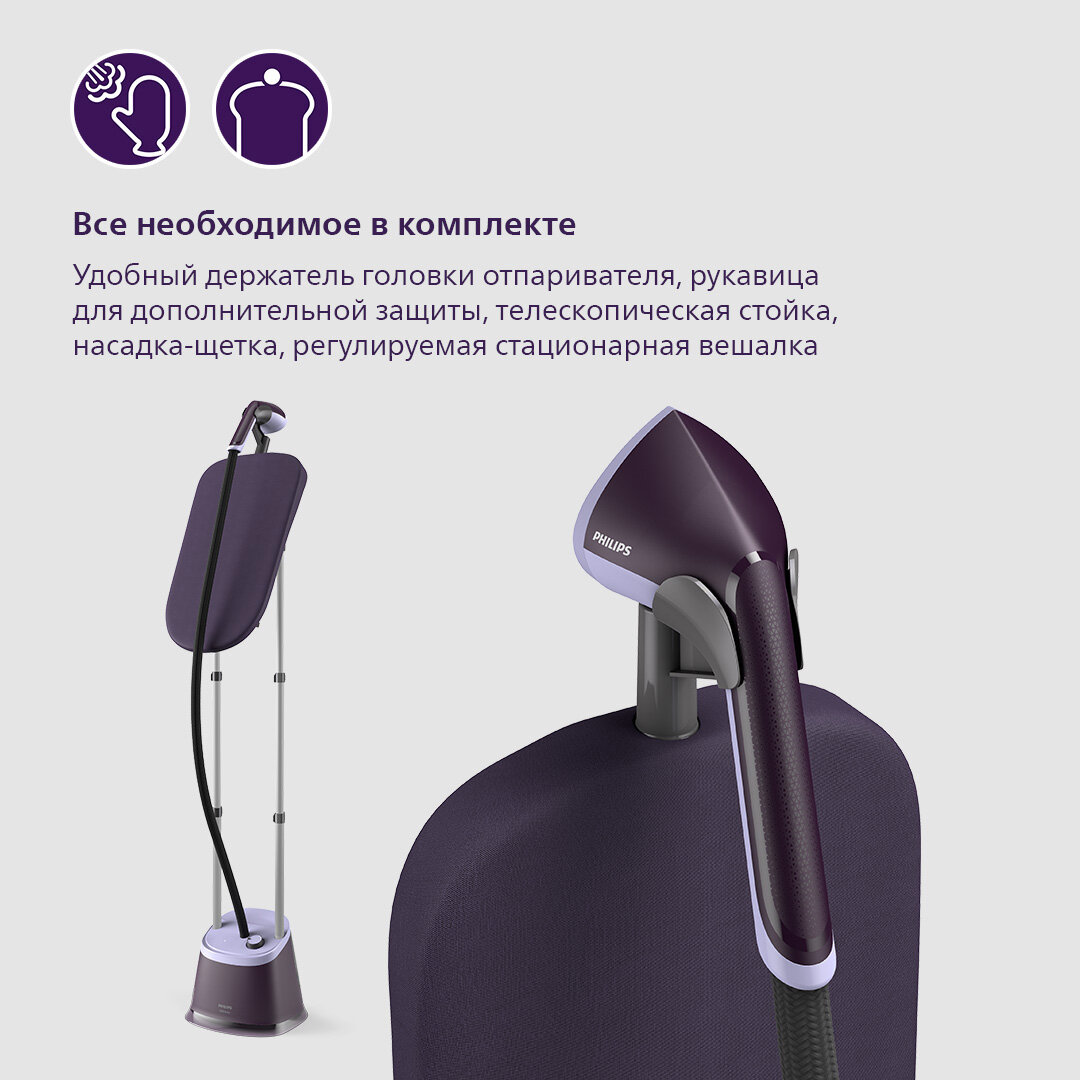 | Дополнительная информация | Удобный держатель головки отпаривателя, рукавица для дополнительной защиты, регулируемая стойка, щетка, регулируемая стационарная вешалка |