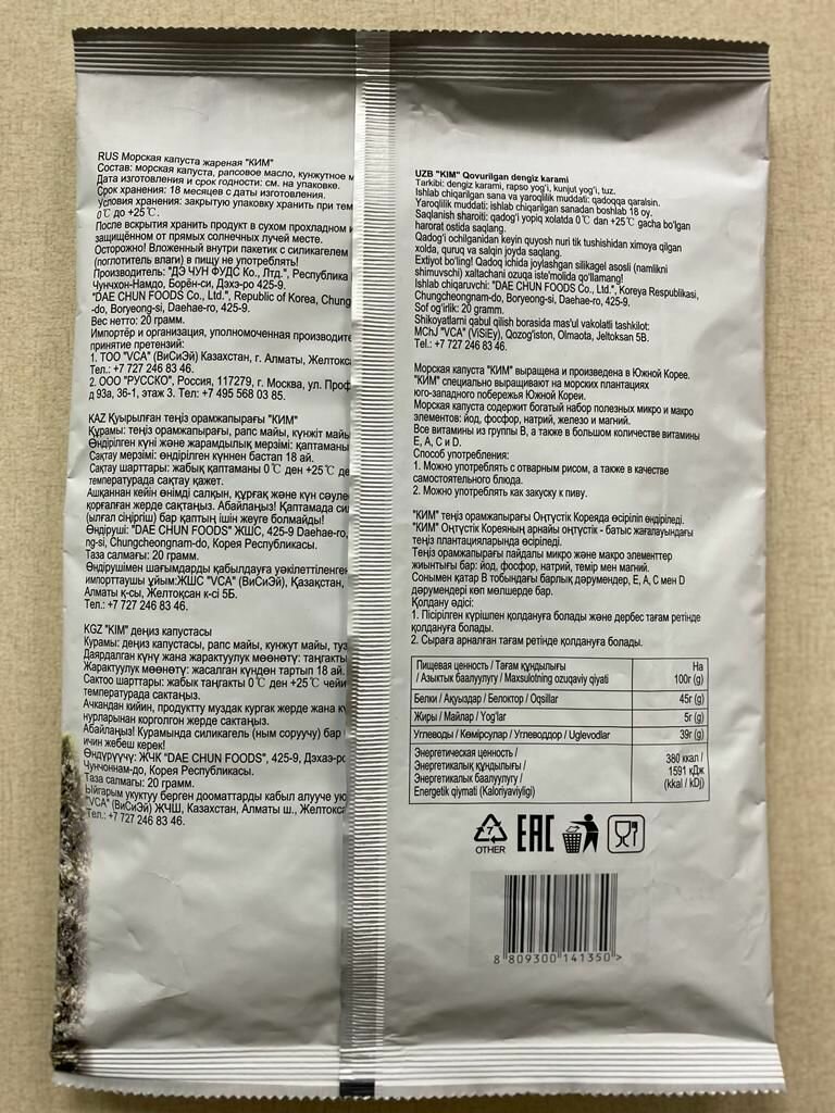Ниже Вы можете прочитать отзывы на Морская капуста жареная "КИМ" в кунжутном масле, 6 листов, 20гр, ознакомится с подробными характеристиками, посмотреть интересные обзоры и фотографии на Морская капуста жареная "КИМ" в кунжутном масле, 6 листов, 20гр.