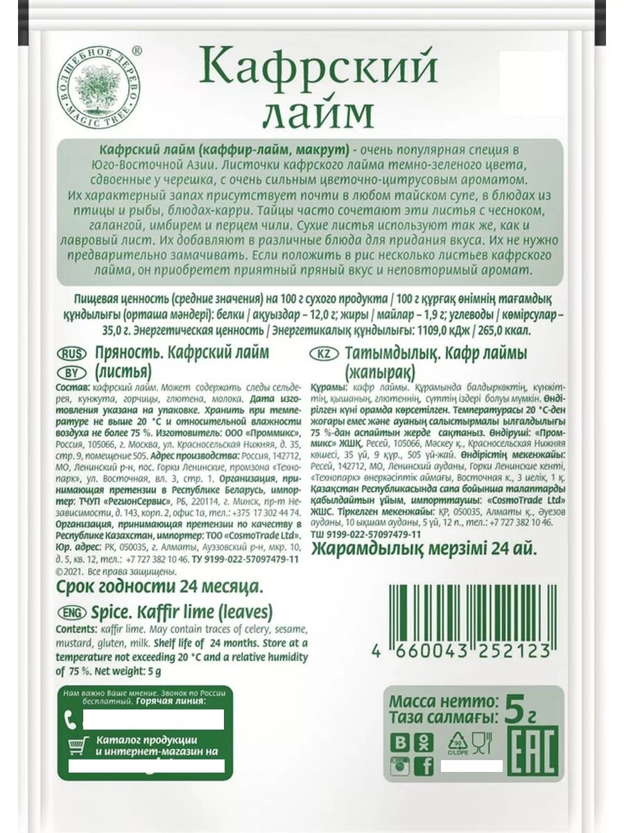 | Состав | Кафрский лайм, галанга, лемонграсс. Продукт может содержать следы сельдерея, кунжута, горчицы, глютена, молока. |