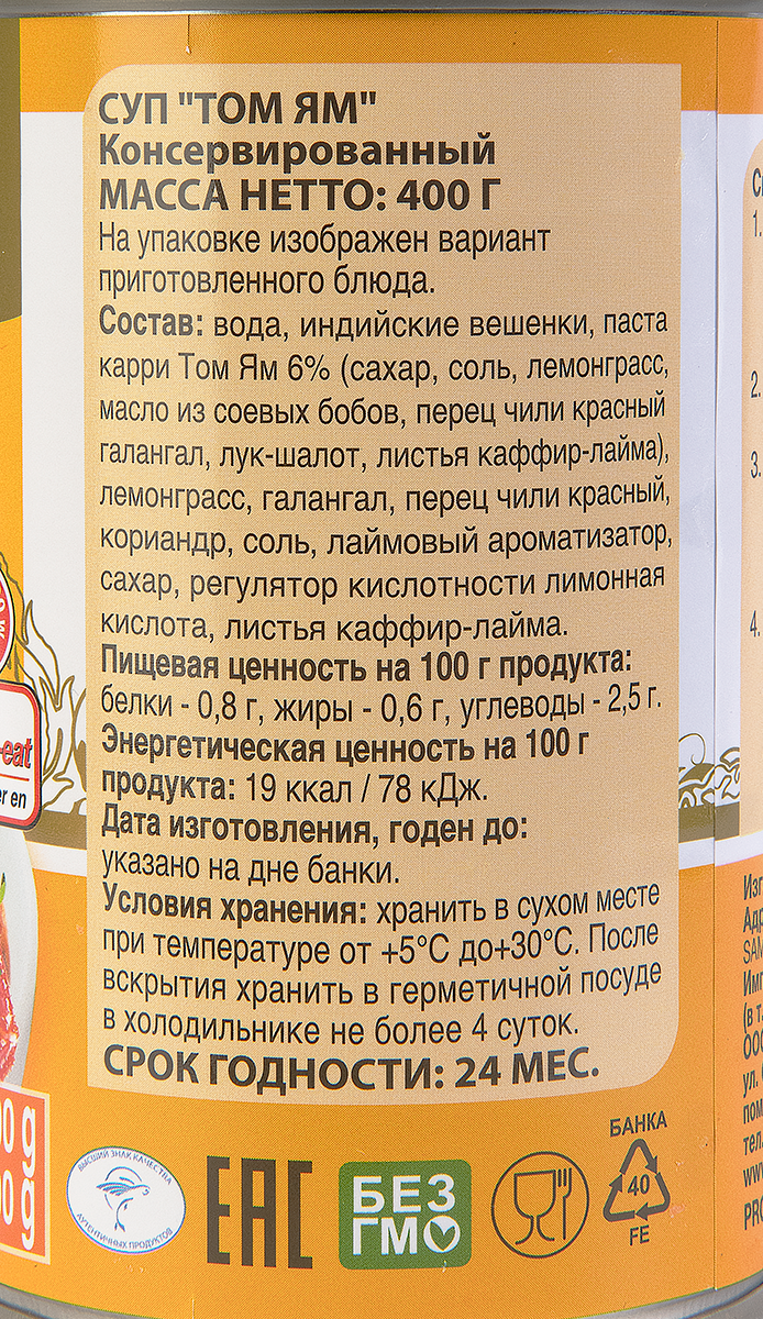 | Состав | Вода, индийские вешенки, паста карри Том Ям 6%(сахар, соль, лемонграсс, масло из соевых бобов, перец чили красный, галангал, лук-шалот, листья каффир-лайма), лемонграсс, галангал, перец чили красный, коринадр, соль, лаймовый ароматизатор, сахар, регулятор кислотности лимонная кислота, листья каффир-лайма |
