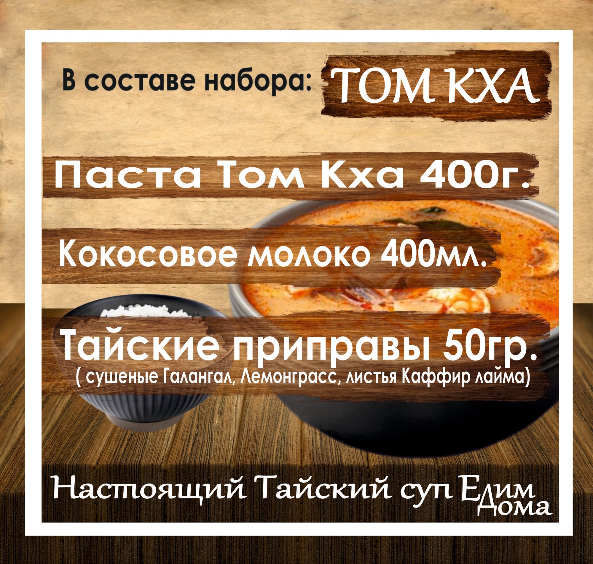 | Состав набора | Паста Том Кха 400, приправы для супа (листья кафир-лайма, лемонграсс, и галангал) |