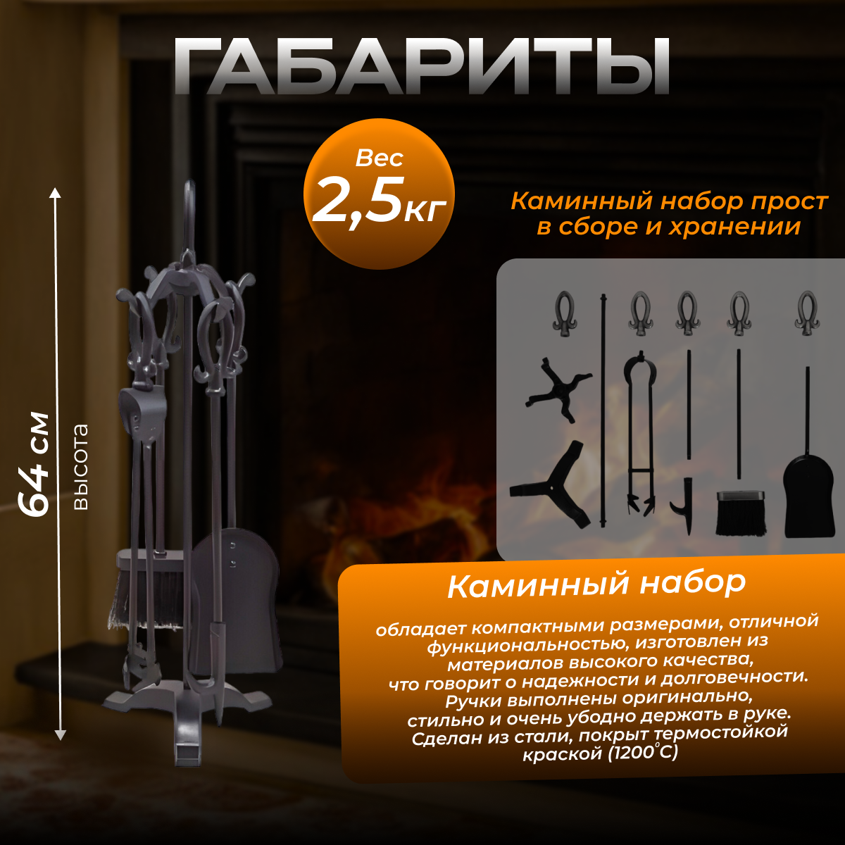 Набор каминный D15016ВК (4 предмета, 64см, черный), на подставке интересное: