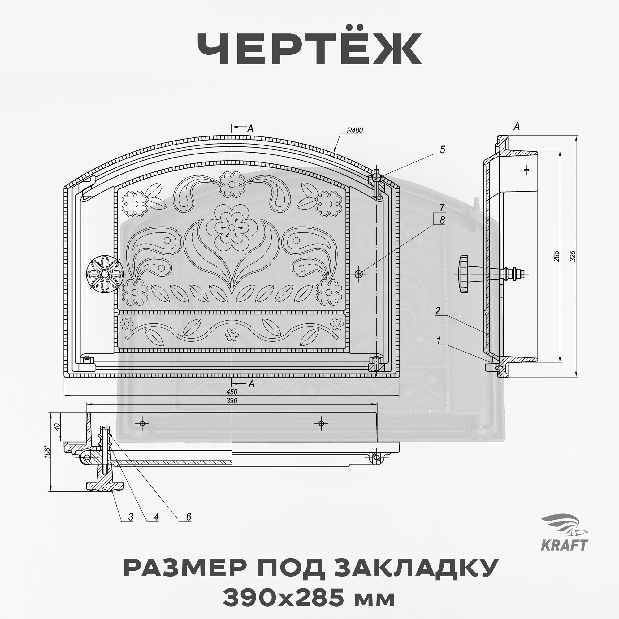 Дверка каминная топочная печная чугунная ДТК 450х325 мм размер под закладку 390х285 мм интересное: