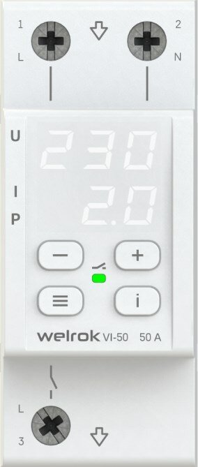 Реле напряжения с контролем тока и мощности Welrok VI-50 цифровой, 2 белых дисплея.