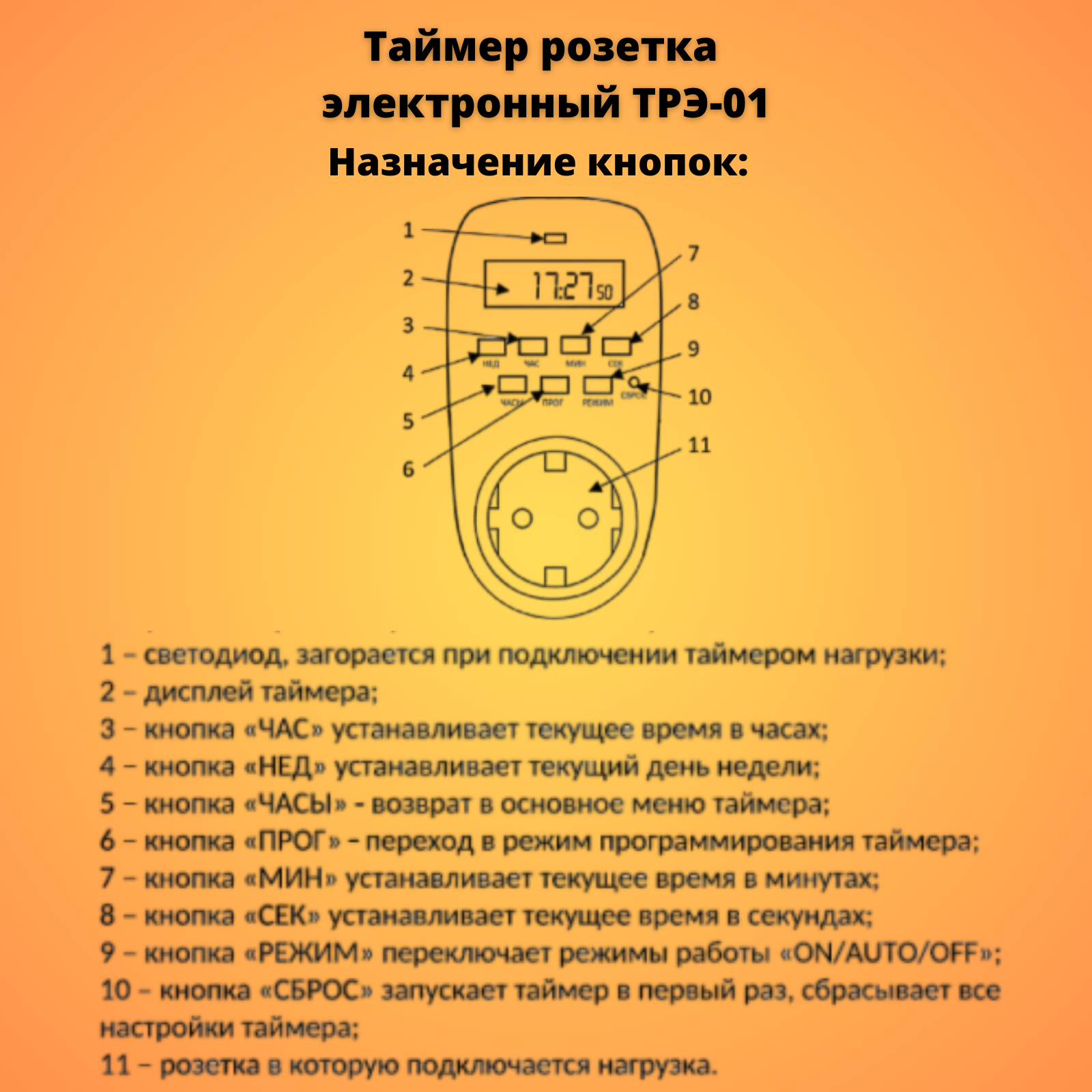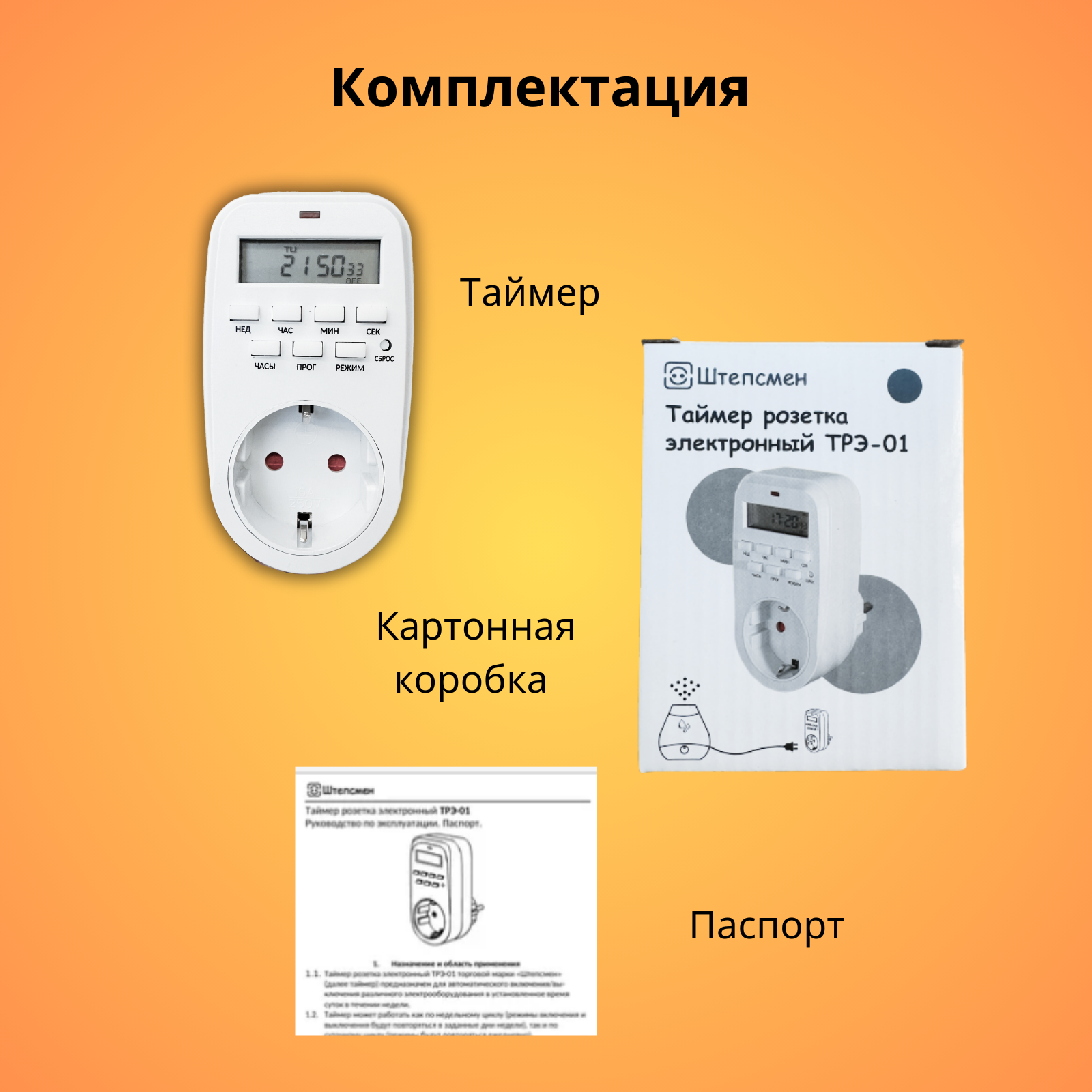 | Комплектация | - Таймер розетка электронный ТРЭ-01; - Руководство по эксплуатации; - Индивидуальная упаковка. |