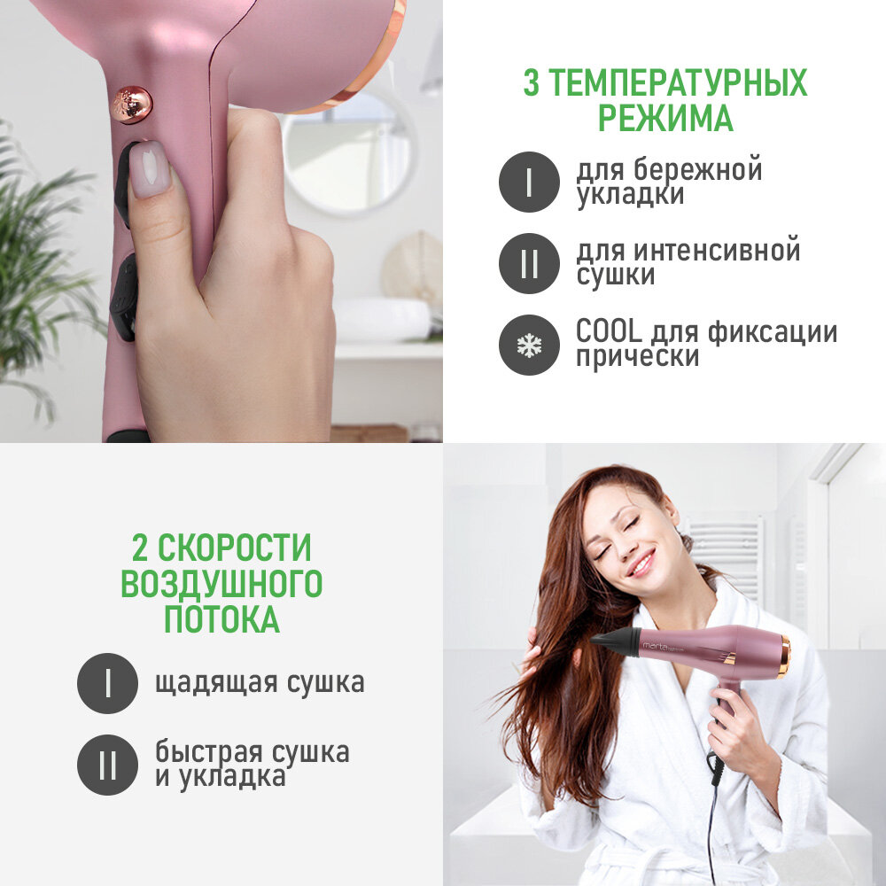 Фен MARTA MT-HD1401B розовый опал tourmaline ionic интересное: